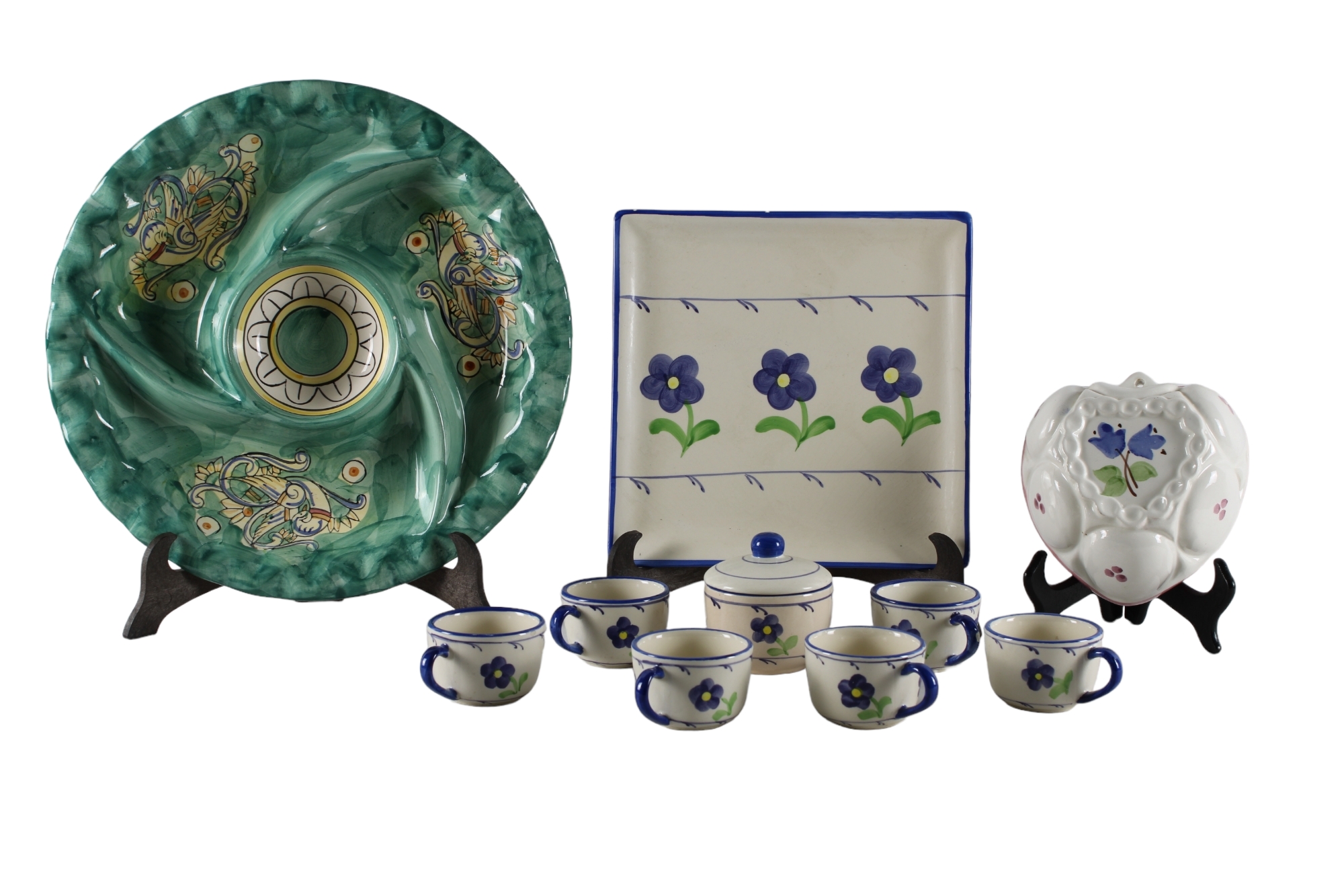 1 vassoio con 6 tazze e 1 zuccheriera, 1 antipastiera, 1 formella in terracotta maiolicata vecchia fattura misure varie