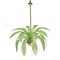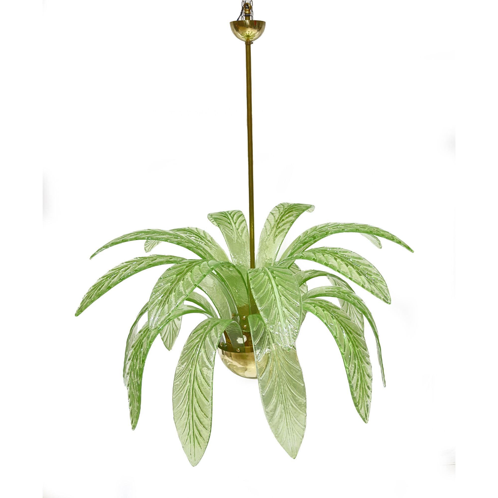 Lampadario in ottone e vetro a tre luci, XX secolo, qualificato da due giri di foglie di palma che emergono da una semisfera, cm. 115x105 circa
