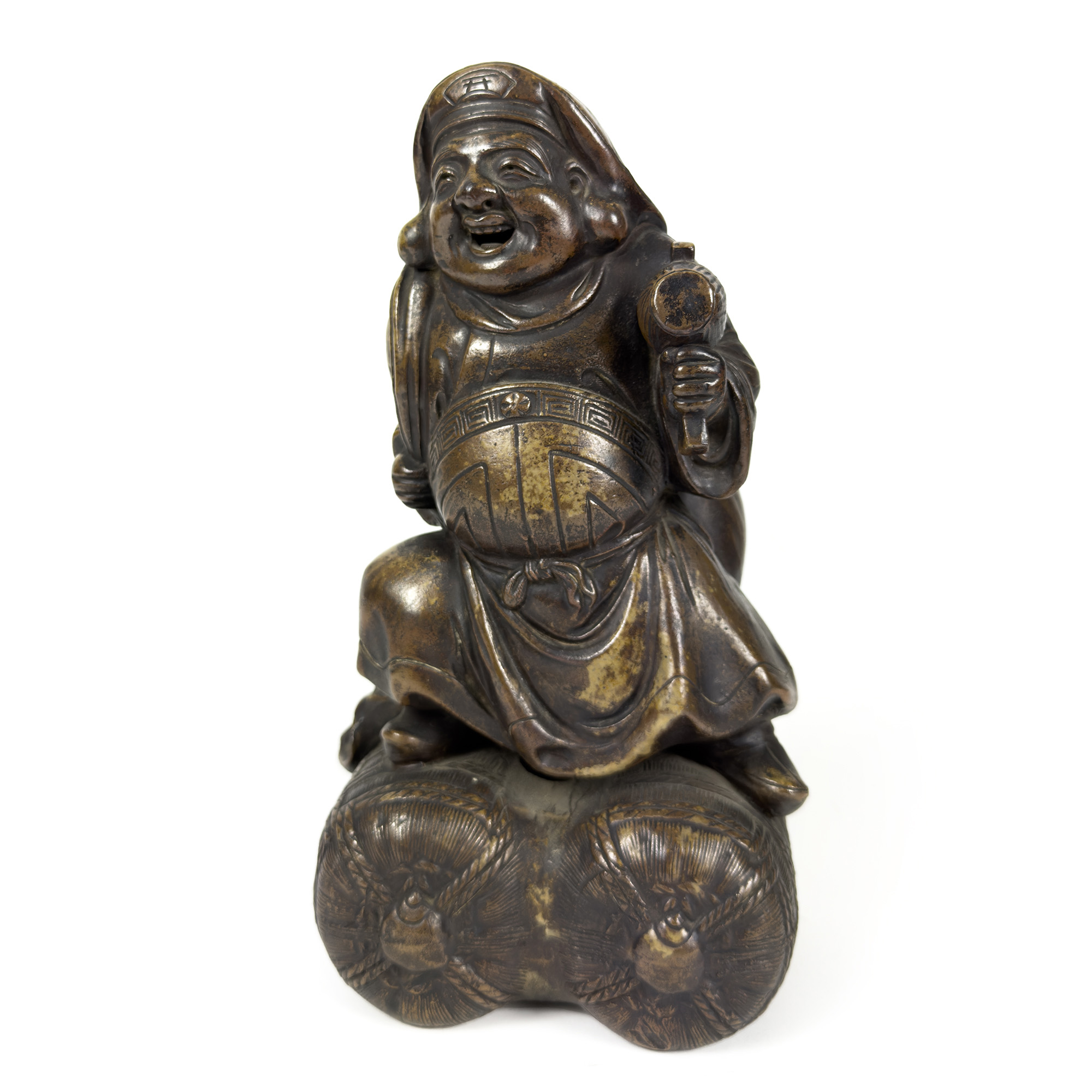 Scultura in pietra saponaria, Arte orientale, inizi del XX secolo, scolpita a raffigurare un personaggio con martello seduto su due sacchi, h. cm. 30