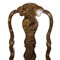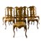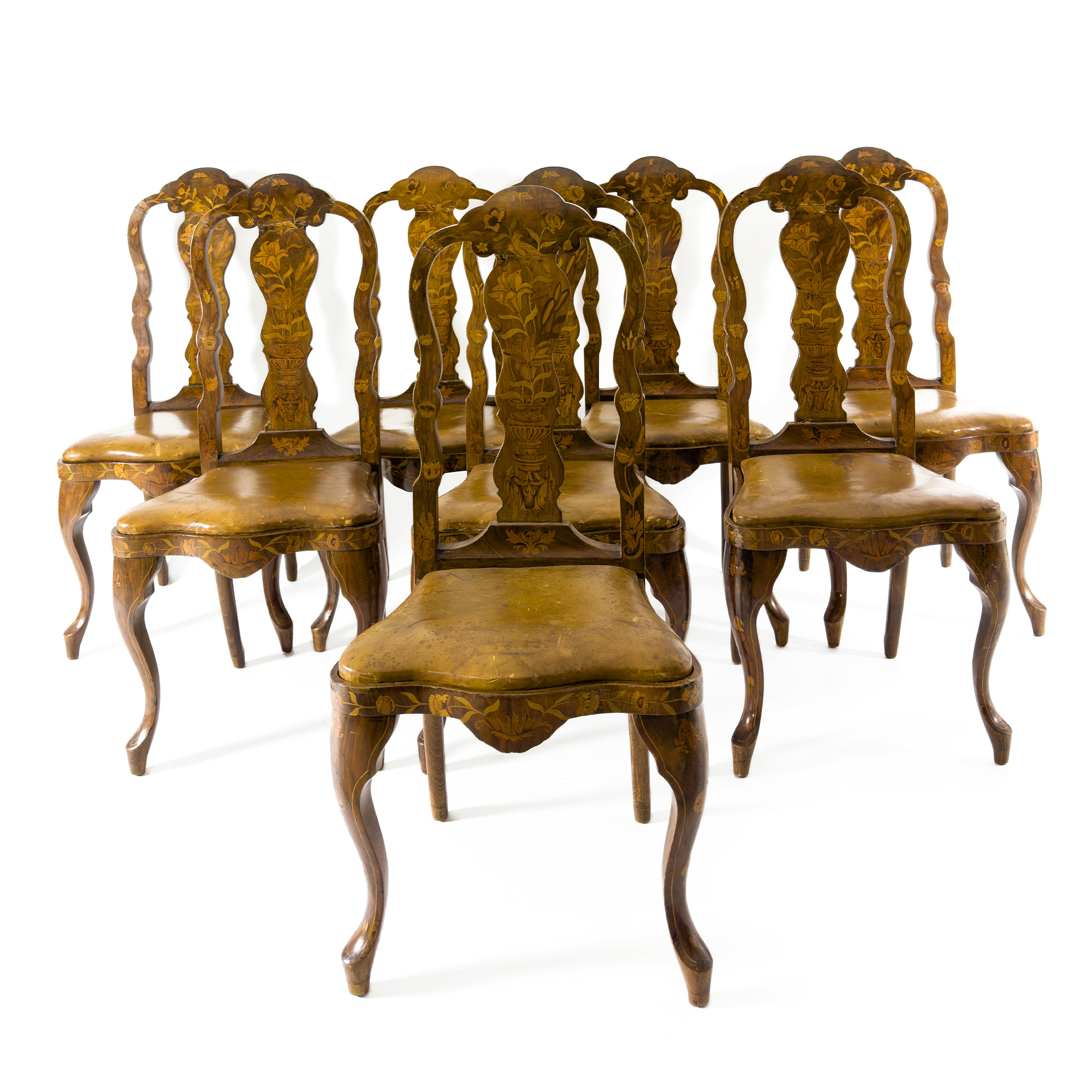 Otto sedie a pattona, Olanda, XIX secolo, di noce intarsiate a fitti motivi floreali sulla cartella dello schienale verticale e lungo il grembiale di forma centinata; gambe anteriori a voluta, quelle posteriori di linea sfuggente. Seduta rivestita in cuoio (difetti)
