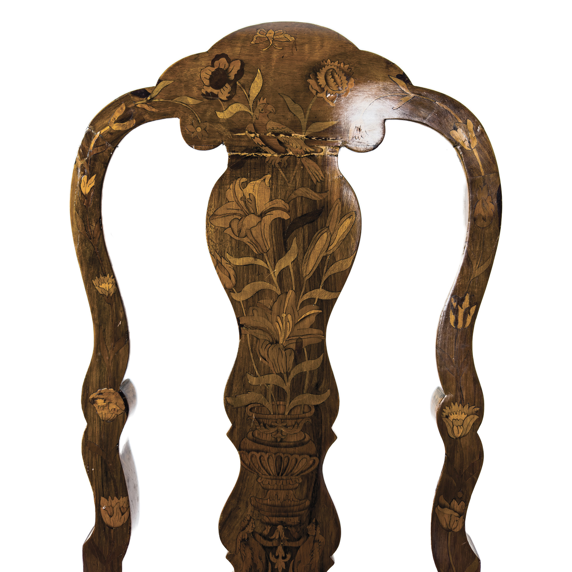 Otto sedie a pattona, Olanda, XIX secolo, di noce intarsiate a fitti motivi...