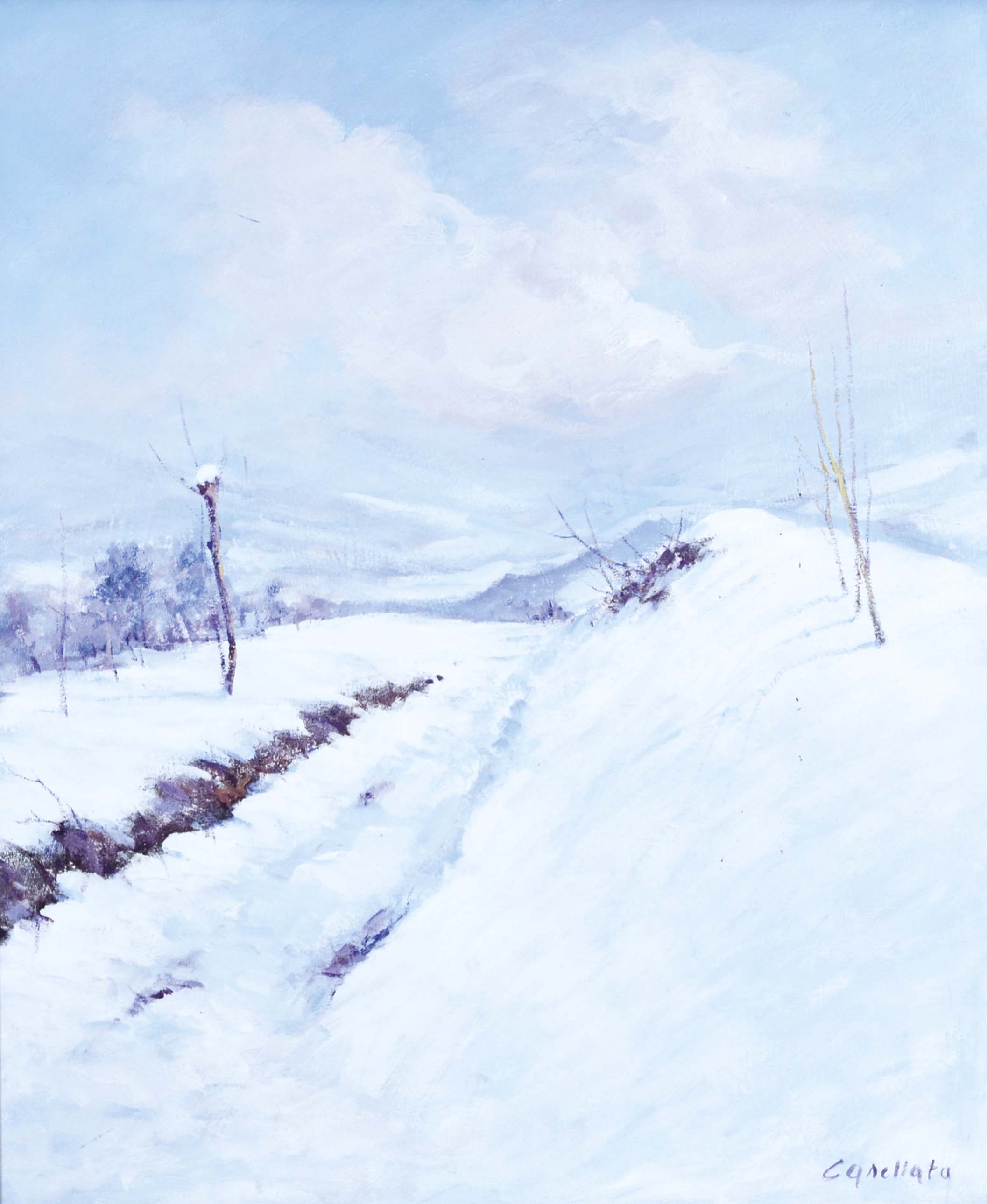 CASELLATO GILBERTO Venezia 1938 Neve a Limana olio su tavola 60x50 firma in basso a destra firma e titolo al retro
