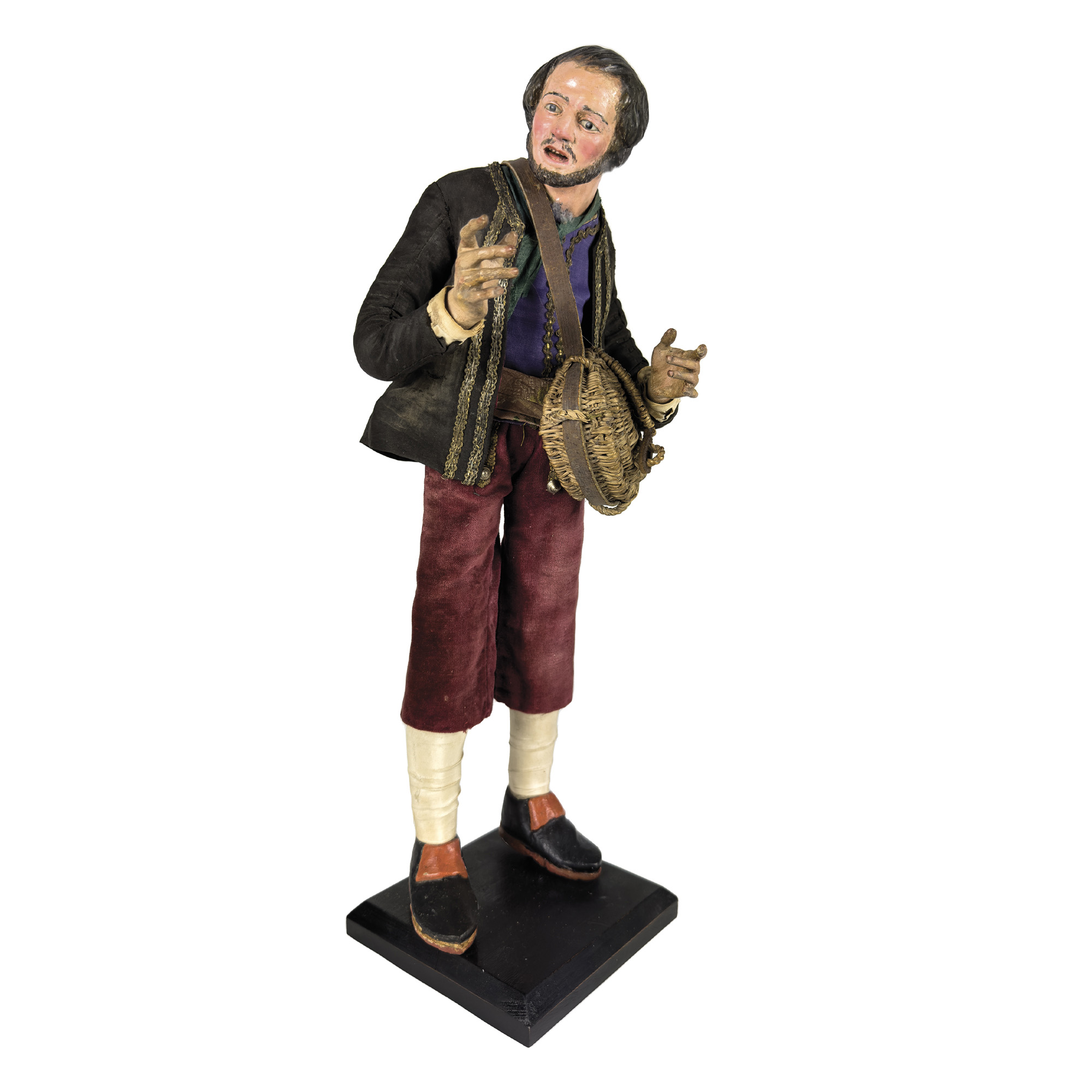 Villano ricco maturo, Vestitura: camicia in tela bianca, panciotto in seta viola ornato da galloni dorati come la giubba in seta marrone e le brache in velluto rosso ciliegia, calze di seta avorio, h. cm. 42.