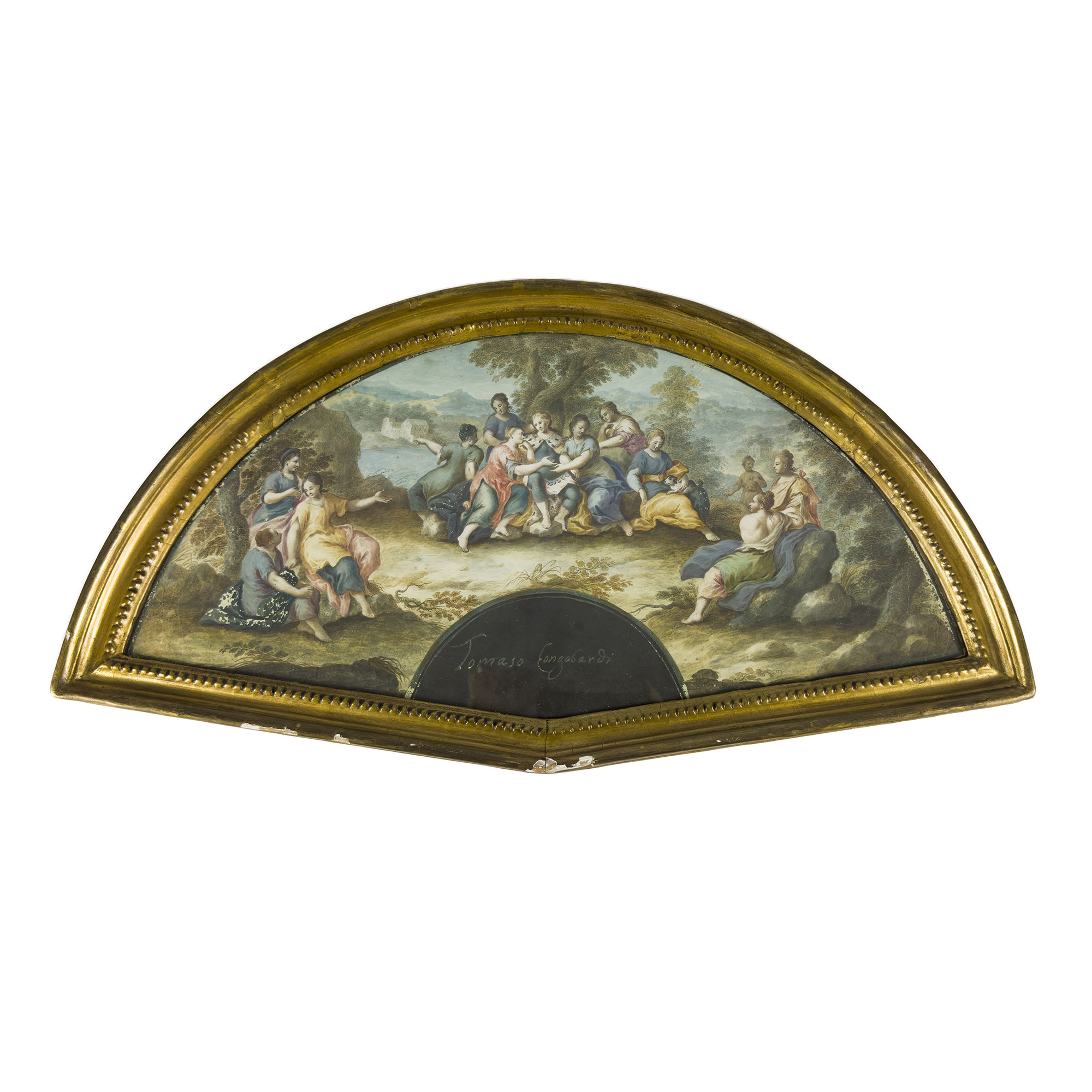 Studio per ventaglio a tecnica mista su carta, XVIII secolo, raffigurante Il Parnaso; firma in basso al centro: Tomaso Longobardi, cm. 26x52 (lievi mancanze)