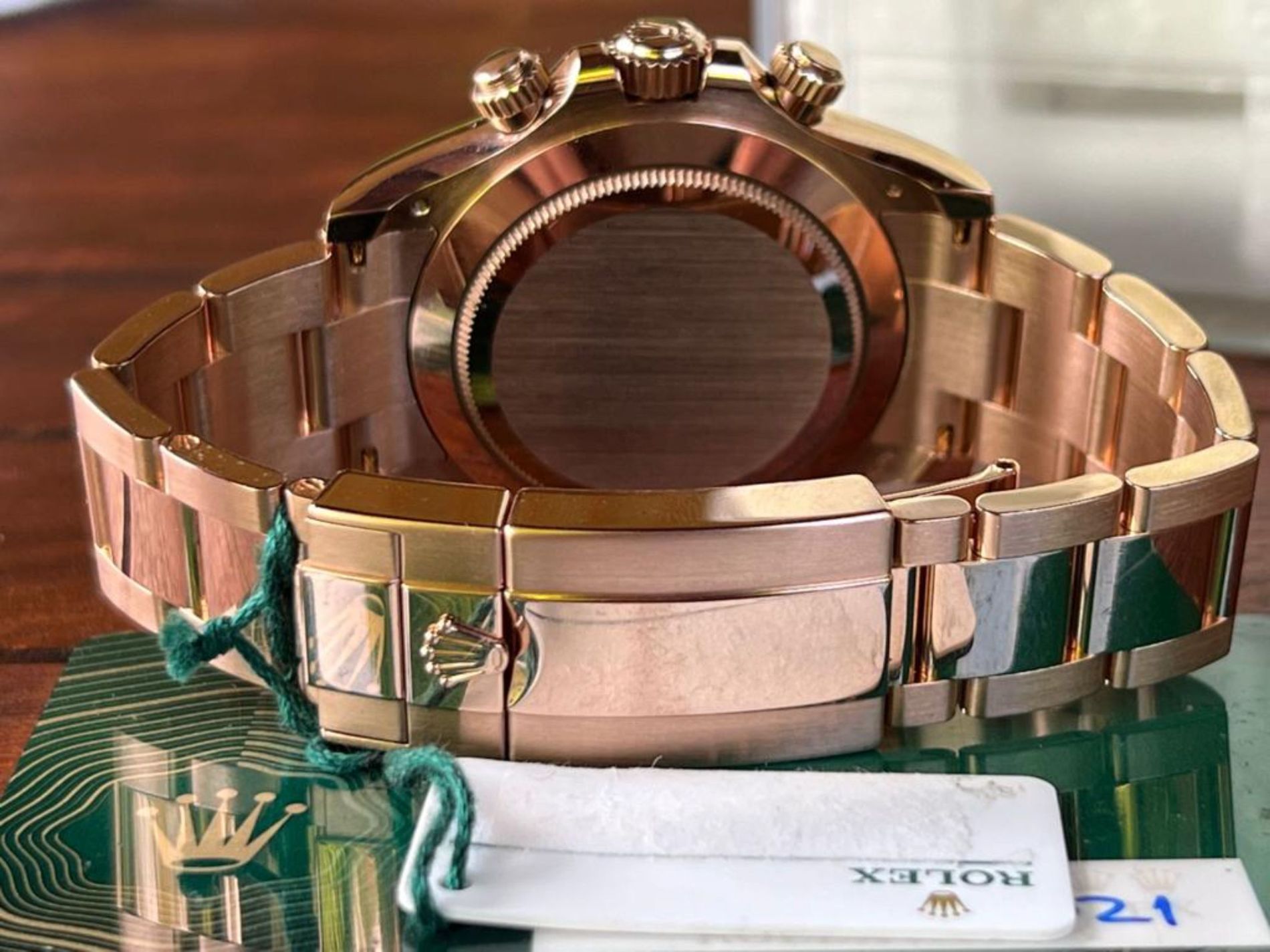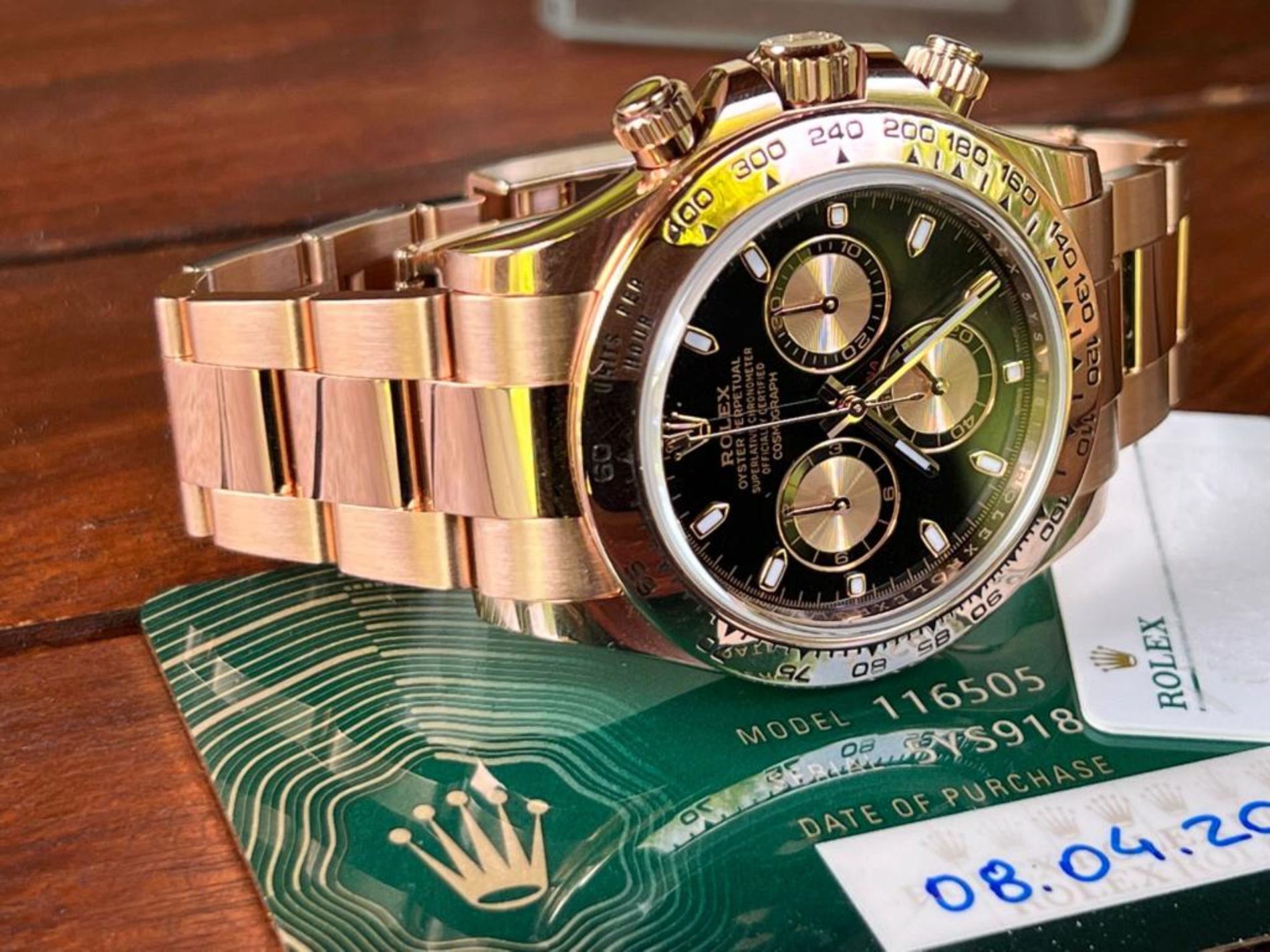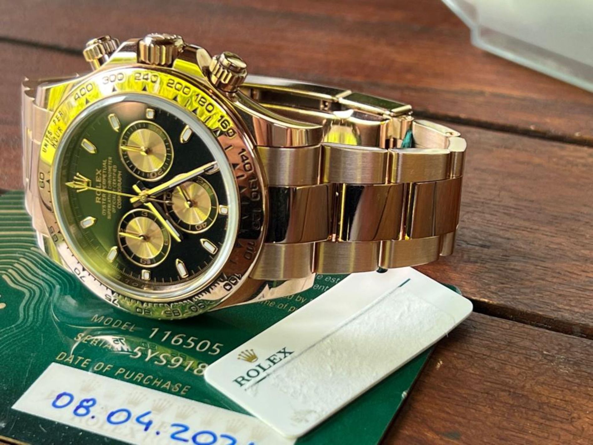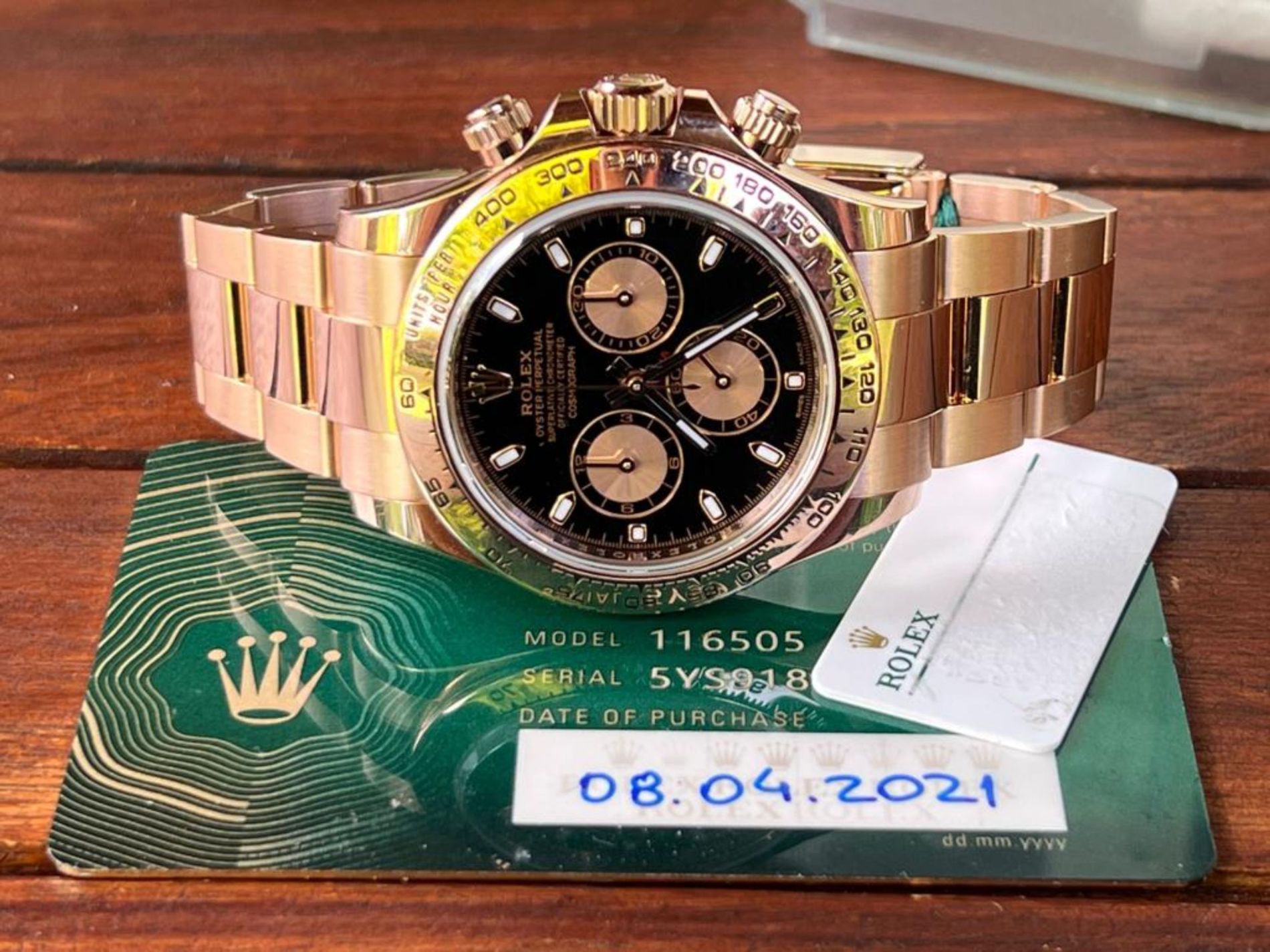 Marca Rolex Modello (Orologio) Daytona Numero di referenza 116505 Carica Automatico Materiale della cassa Oro rosa Materiale cinturino Oro rosa Anno di produzione 2021 Condizione Corredo Con documenti originali Calibro Carica Automatico Cassa Materiale della cassa Oro rosa Diametro 40 mm Impermeabile 10 ATM Materiale lunetta Oro rosa Vetro zaffiro Quadrante Nero Numeri sul quadrante Senza numeri Cinturino Materiale cinturino Oro rosa Colore cinturino Oro Chiusura Déployante Materiale chiusura Oro rosa Funzioni Cronografo