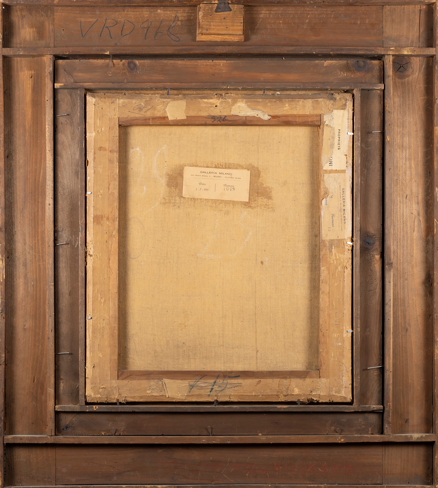 Sul retro: sulla tela, antico cartellino a stampa della Galleria Milano con data 1.7.931 e numero di riferimento (1048); sul telaio altro cartellino a stampa della Galleria Milano e cartellino a stampa strappato Proprietà...ini.