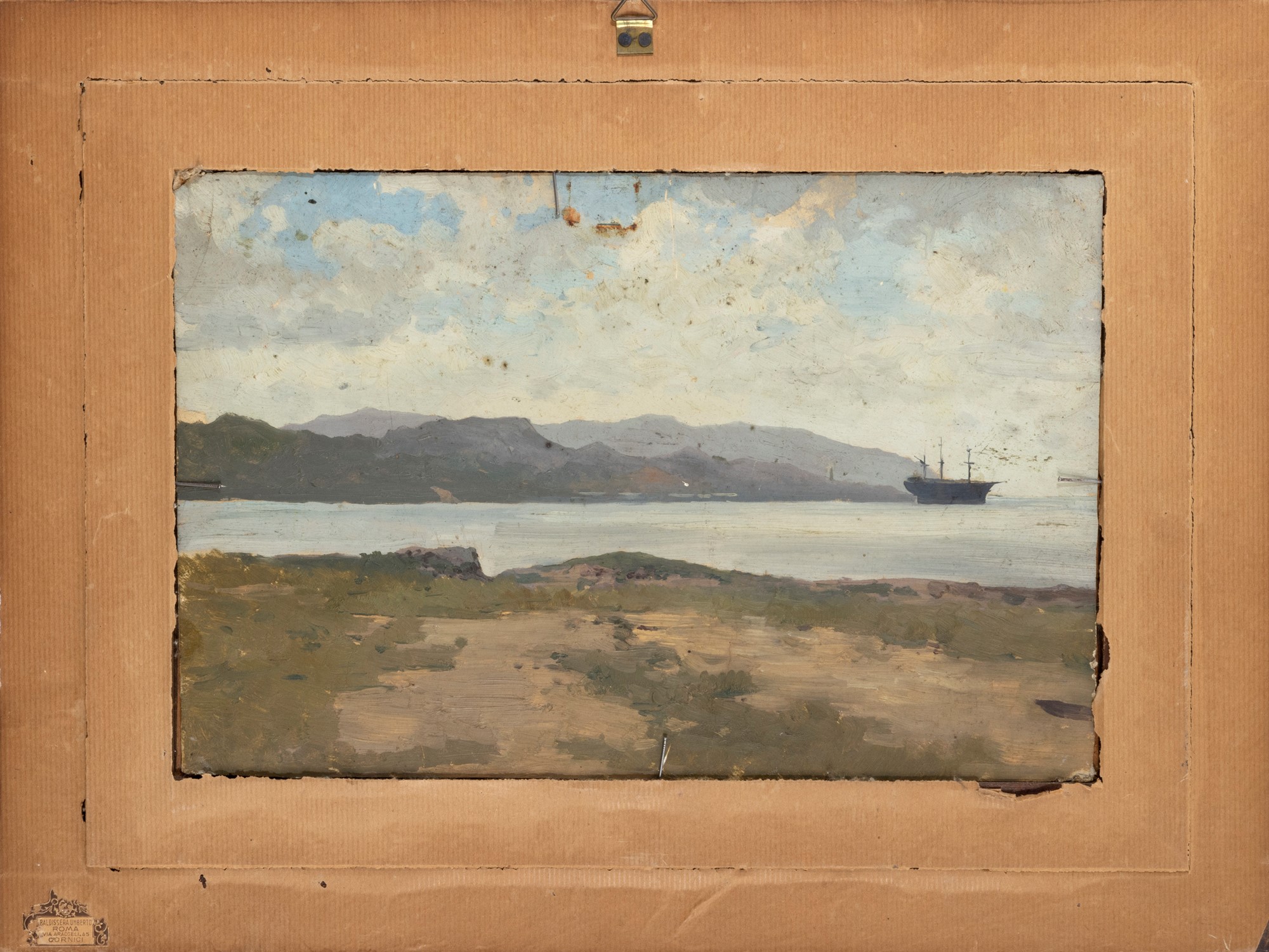 Sul retro, altro dipinto di mano dell'artista con paesaggio marino e nave.