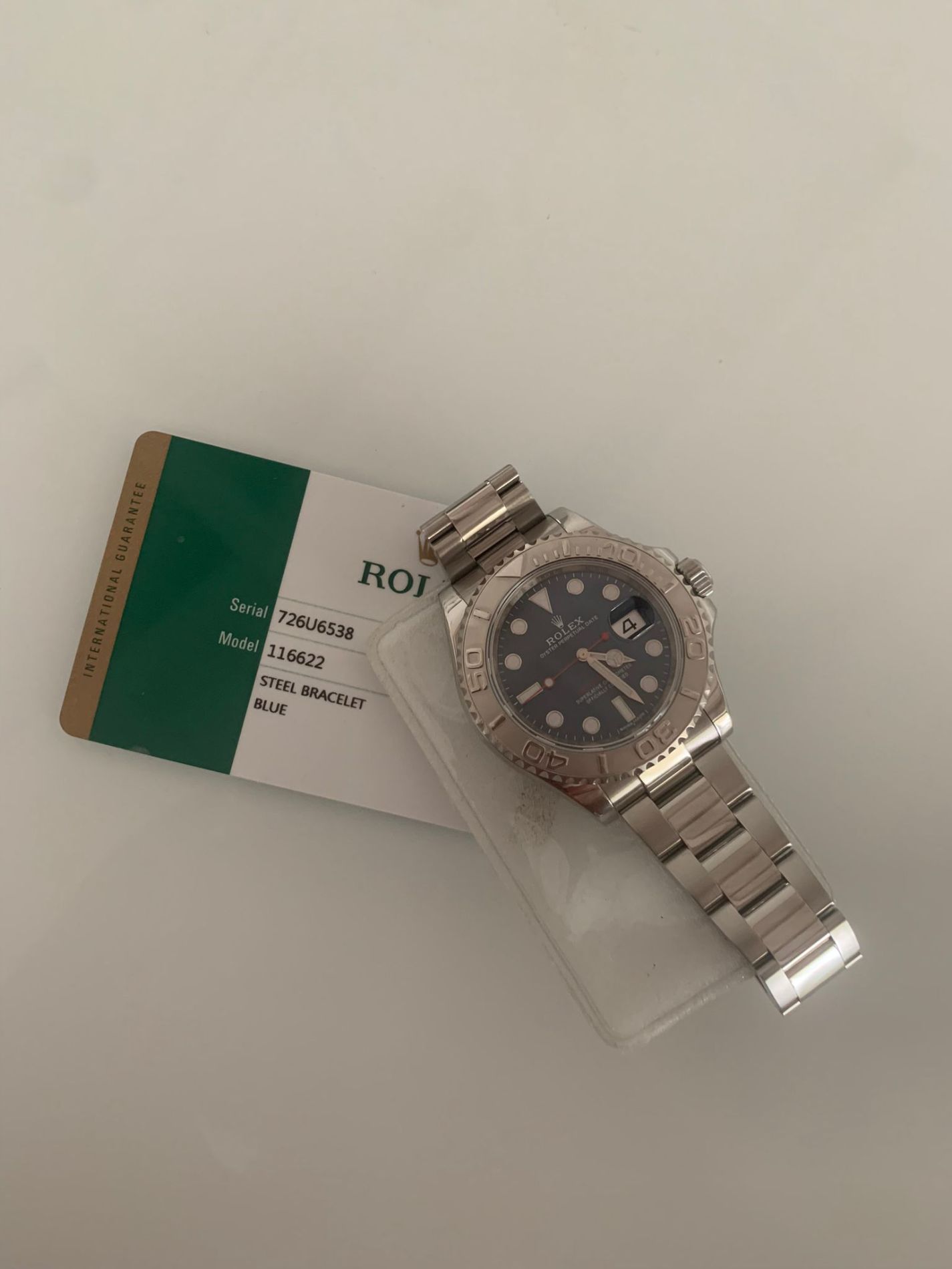 Marca Rolex Modello (Orologio) Yacht-Master 40 Numero di referenza 116622 Carica Automatico Materiale della cassa Acciaio Materiale cinturino Acciaio Anno di produzione 2017 Corredo documenti originali Rolex Materiale della cassa Acciaio Diametro 40 mm Impermeabile 10 ATM Materiale lunetta Platino Vetro Vetro zaffiro Quadrante Blu Numeri sul quadrante Senza numeri Cinturino Materiale cinturino Acciaio Colore cinturino Acciaio Chiusura Déployante Materiale chiusura Acciaio