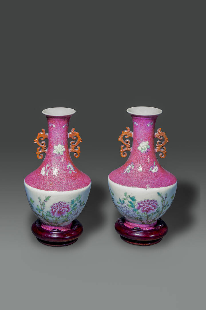 Coppia di vasi Famiglia Rosa con decori floreali su fondo rosa, Cina, Repubblica, XX sec