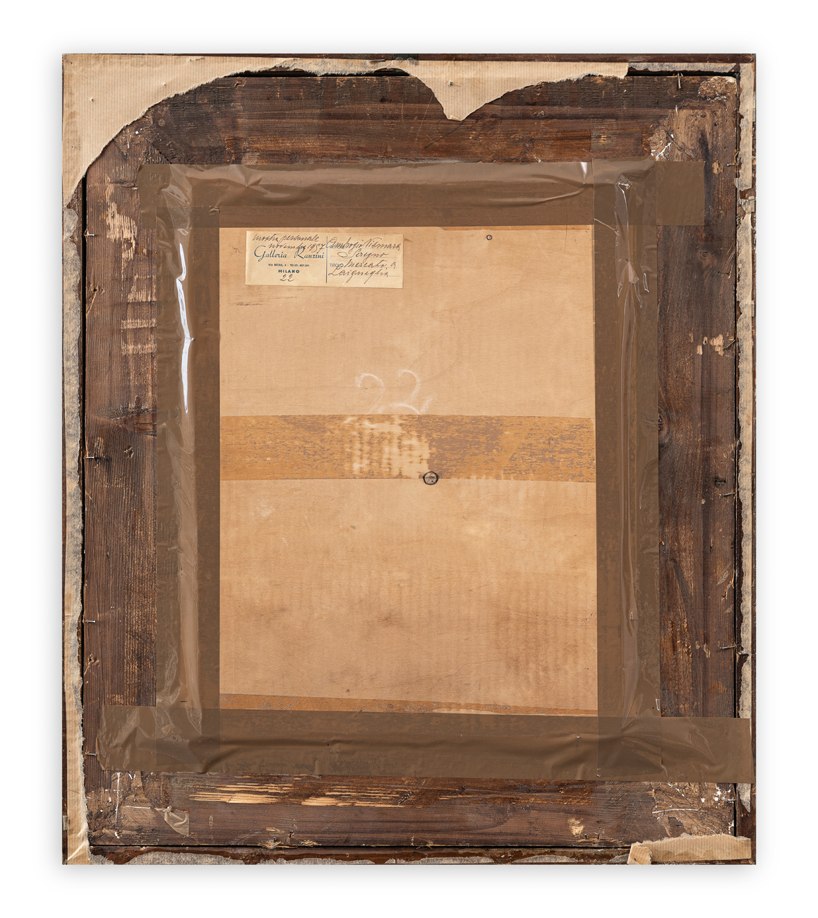 Etichetta della Galleria Ranzini (MI) con caratteristiche tecniche dell'opera al retro