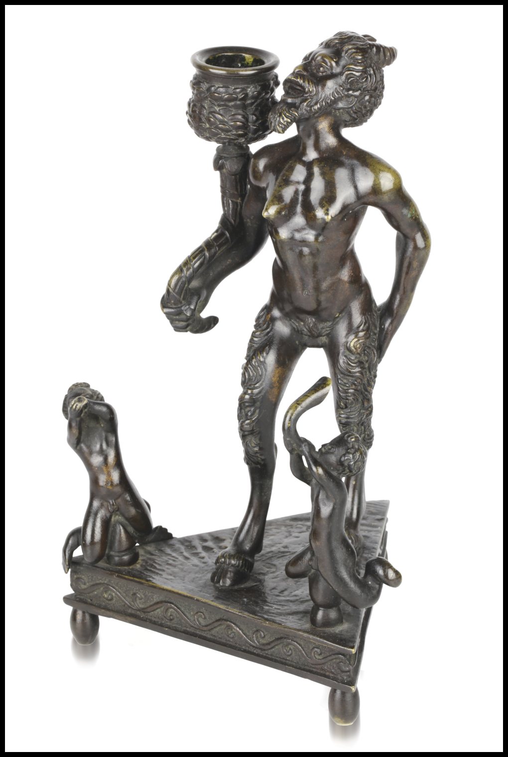 Questo originalissimo candeliere rappresenta un satiro nell'atto di camminare, nella mano destra una cornucopia a cui è avvitata una bobege a forma di pigna.