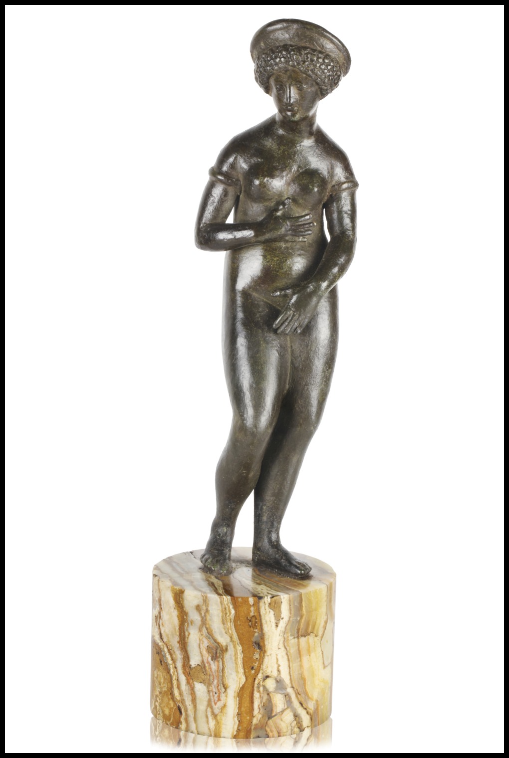 Questo affascinante e raro bronzetto, raffigura una matrona romana atteggiata a Venere pudica, una mano sul seno ed una sulla natura.