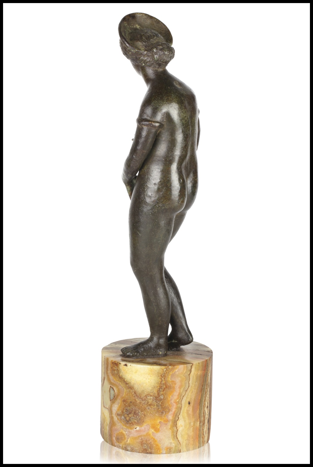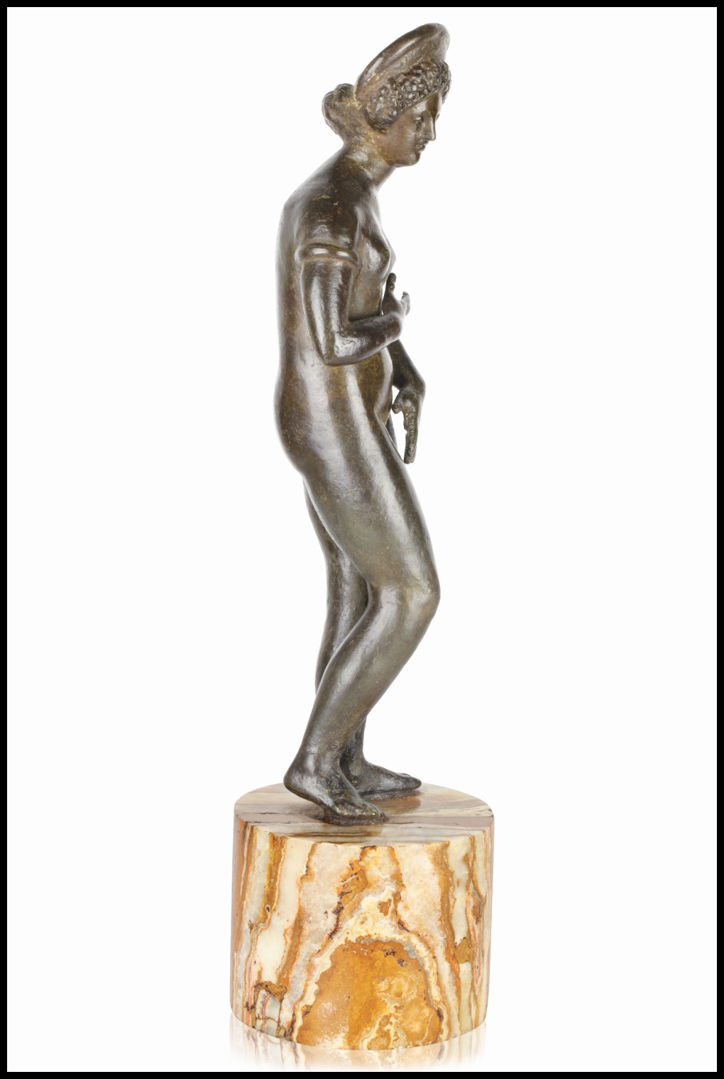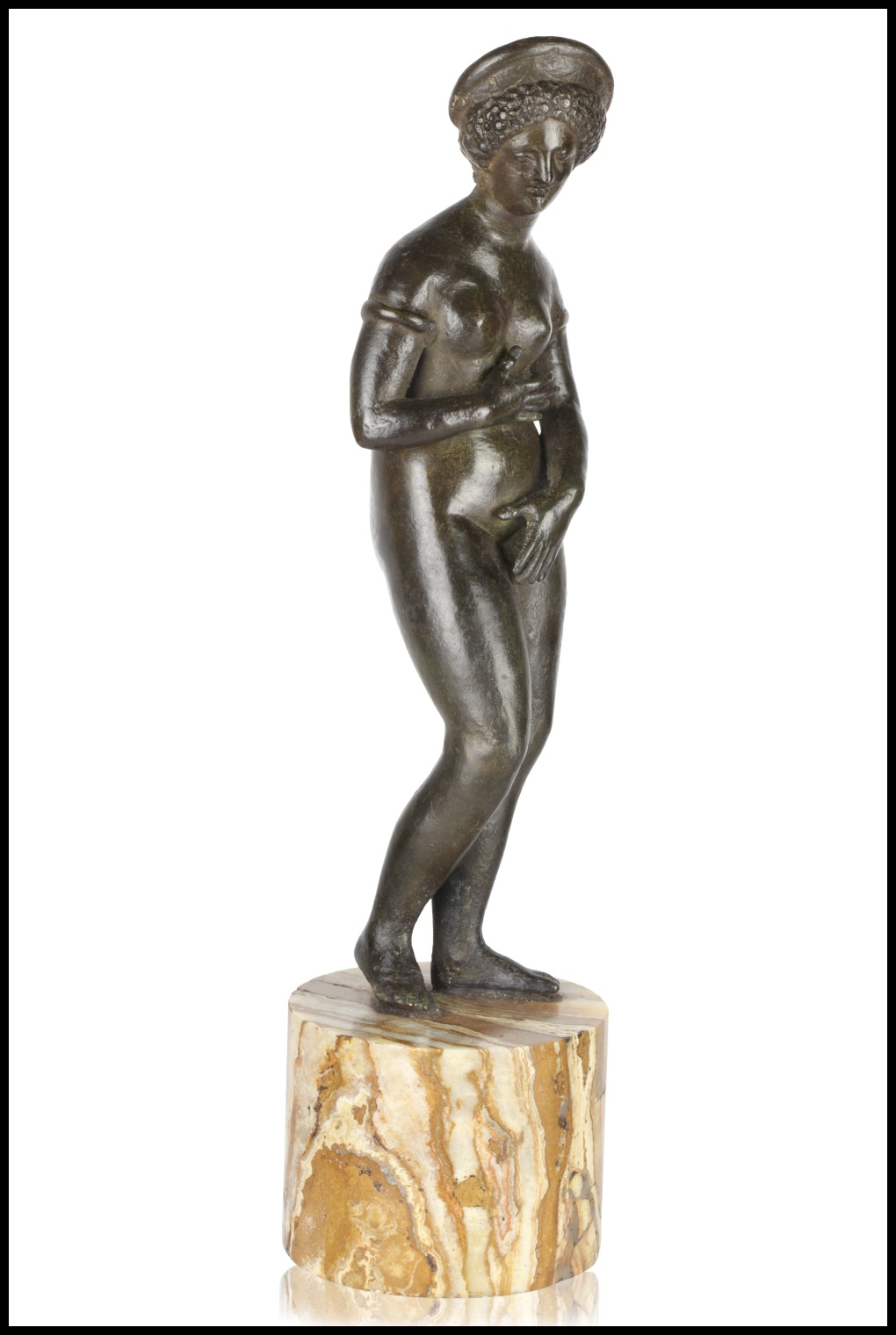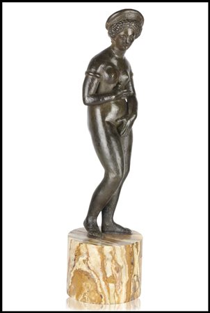 La cosa curiosa di questo nostro bronzetto è che la testa della Venere ricalca perfettamente i ritratti femminili di epoca adrianea. L'inconfondibile pettinatura a fitti riccioli incorniciati da un diadema riporta l'iconogragia della Venus Pudica alla realtà di un personaggio vero che con essa si identifica.