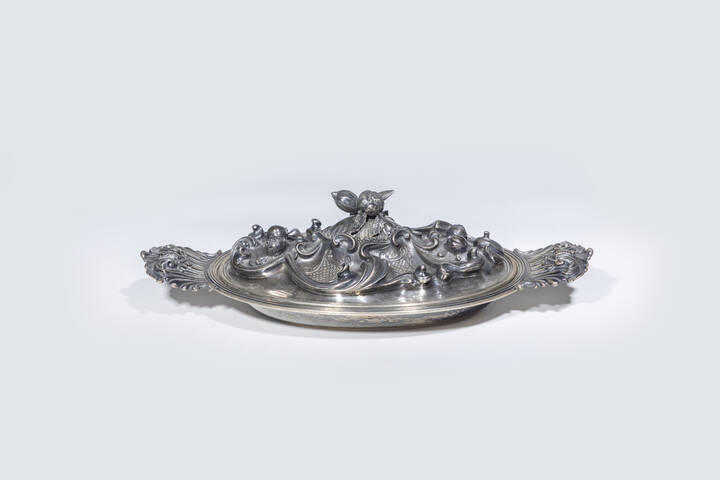 in argento, di forma ovalizzata, manici a volute e coperchio sbalzato ed inciso a motivi di volute e melograni.