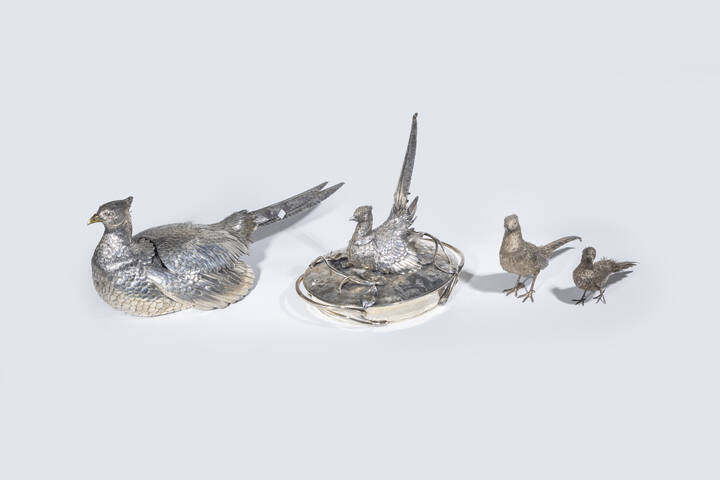 -1 centrotavola a forma di grande fagiano: le ali celano un vano interno portavivande ed un elemento del piumaggio della coda diventa un mestolo. Peso gr 3112,6