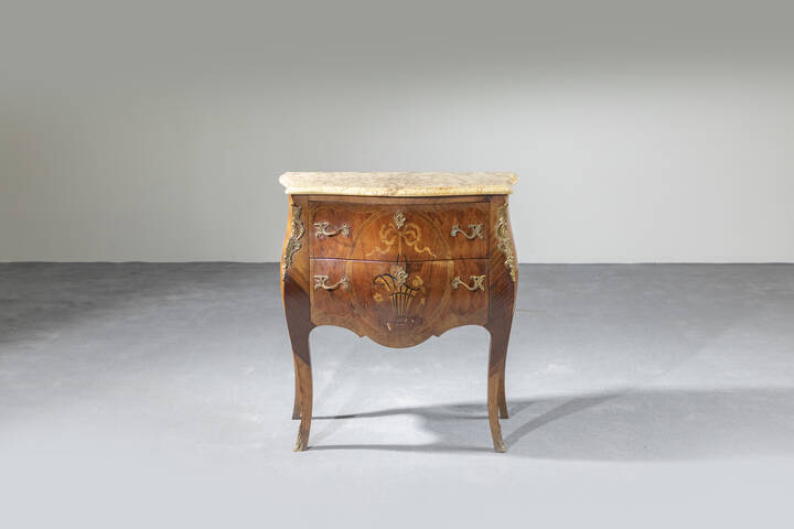 XX secolo, a due cassetti, fronte e fianchi bombati, impiallacciato a marqueterie e medaglione centrale con vaso di fiori e nastro; decori in bronzo, piano in marmo