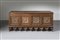 in legno di noce. Fronte composto da quattro pannelli decorati con motivi geometrici ad intarsio e rosoni in stile gotico