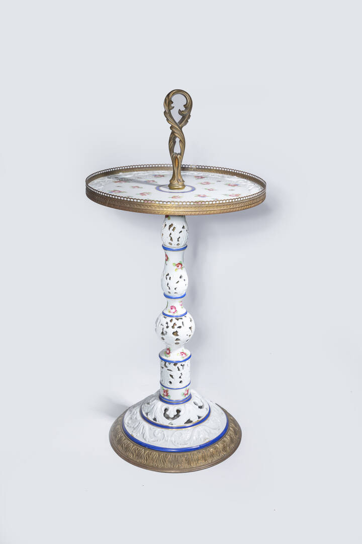in porcellana dipinta con decori a rose; corpo traforato e a volute. Parte superiore con presa e bordo in ottone dorato (difetti alla doratura); base circolare con base in ottone dorato (difetti alla doratura).