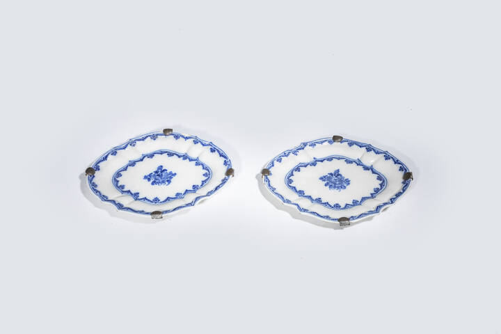 di forma ovalizzata con bordo sagomato; in porcellana bianca con decori blu. XVIII secolo. Presenti sbeccature lungo il bordo.