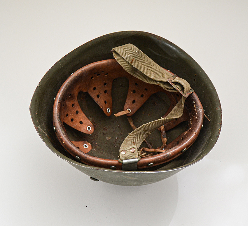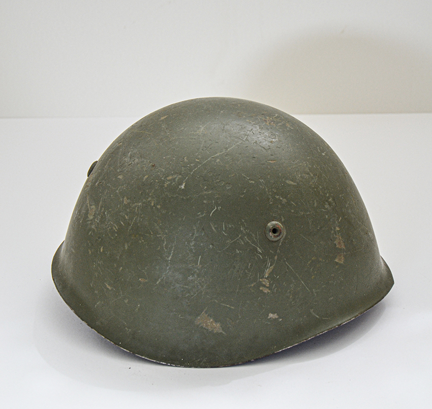 L'elmo presenta una livrea di caserma in verde scuro, databile dalla seconda metà degli anni '70 agli anni '80; si può notare inoltre il soggolo in canapa in colore verde con la fibbia metallica scorrevole e ancorato agli anelli trapezoidali.