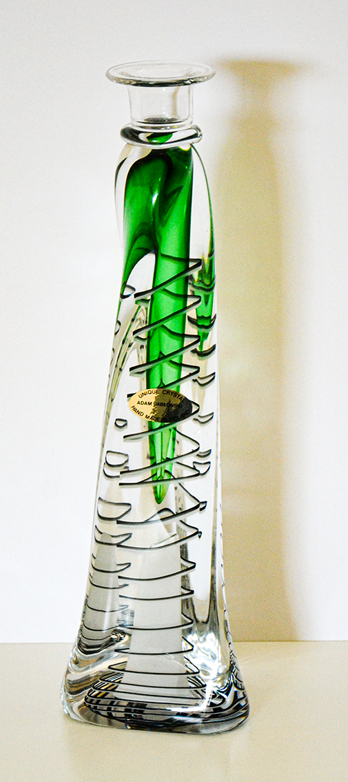Portacandela di forma allunagata e attorcigliata in cristallo trasparente soffiato a mano con spirale nera ed elementi sommersi di colore verde e bianco, realizzata a mano da Adam Jablonski, opera unica.