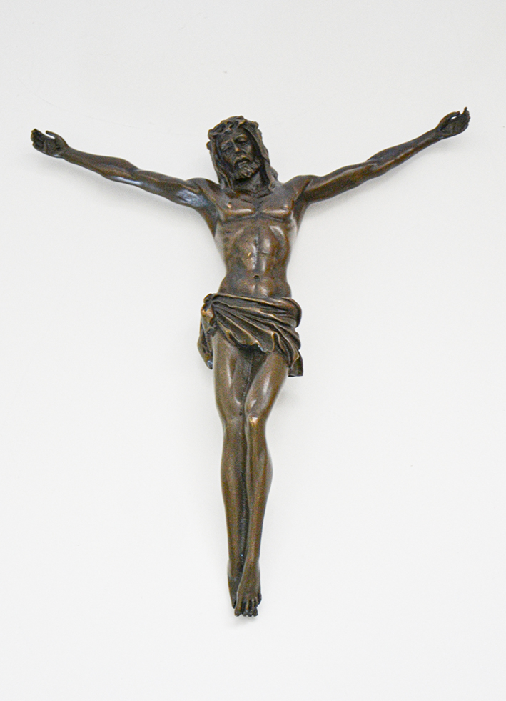 Scultura in bronzo patina scura raffigurante il copro di Cristo, sul retro dell'opera è presente l'esagono con la punzonatura "" JB deposse bronze Garanti Paris"