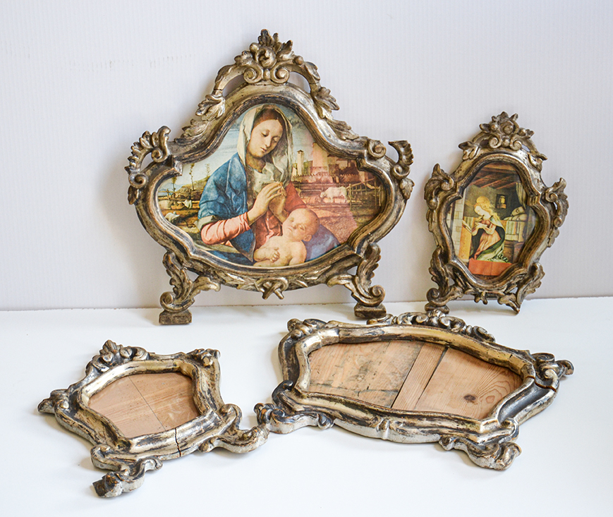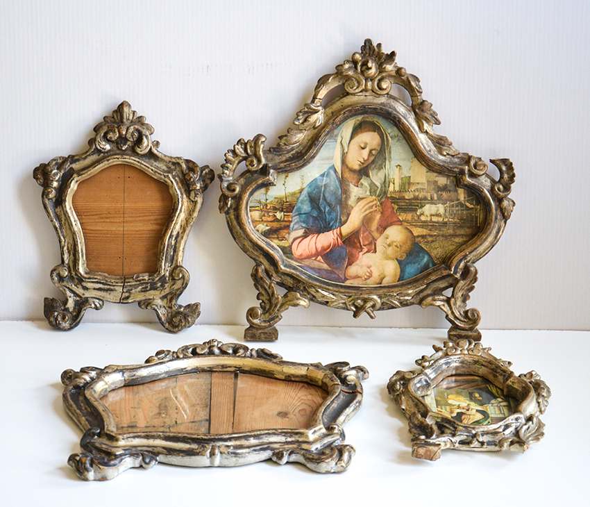 Lotto composto da n° 4 cornici in legno sagomate e intagliate argentate a mecca, si presume di ebanisteria italiana.