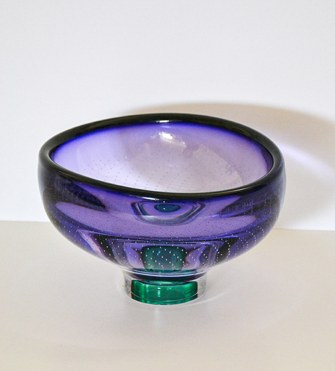 Ciotola realizzata a mano in vetro coloraro e motivo a bolle, progetta da Göran Wärff per Kosta Boda nel 1999.