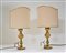 Lotto composto da n° 2 lampade da tavolo in ottone, il portalampada è strutturato come un portacandela con piattino e manico (bugia) che sorregge un elegante paralume in tessuto.
