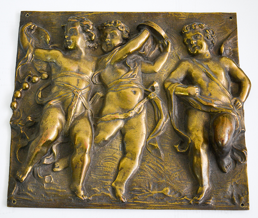 Sbalzo in bronzo raffigurante tre angioletti in un contesto vegetale con rami e foglie, edera o altre piante, il tutto espressione del gusto liberty dell'epoca a cui deve attribuirsi; in origine probabilmente pannello decorativo applicato ad un arredo d'epoca ossia ad un mobile o alla testiera di un letto.