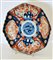 Piatto in porcellana giapponese Imari del periodo Meiji di ottima qualità con tondo centrale blu e bianco circondato da scene di vegetali giapponesi in smalti arancioni e verdi evidenziati con dorature.