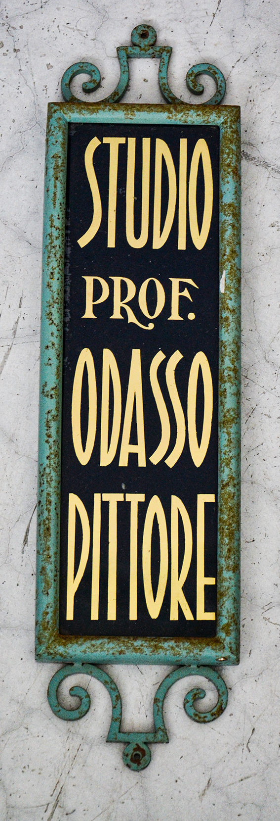 Insegna pubblicitaria con vetrofania "Studio Prof. Odasso Pittore" con elegante cornice da muro in ferro battuto.
