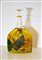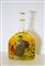 Corpo trasparente di forma appiattita decorato su ogni lato con un pannello rettangolare in rame e schizzi policromi su un fondo giallo screziato.