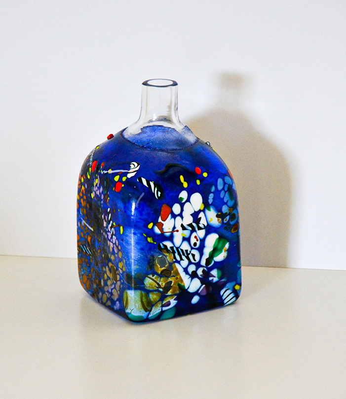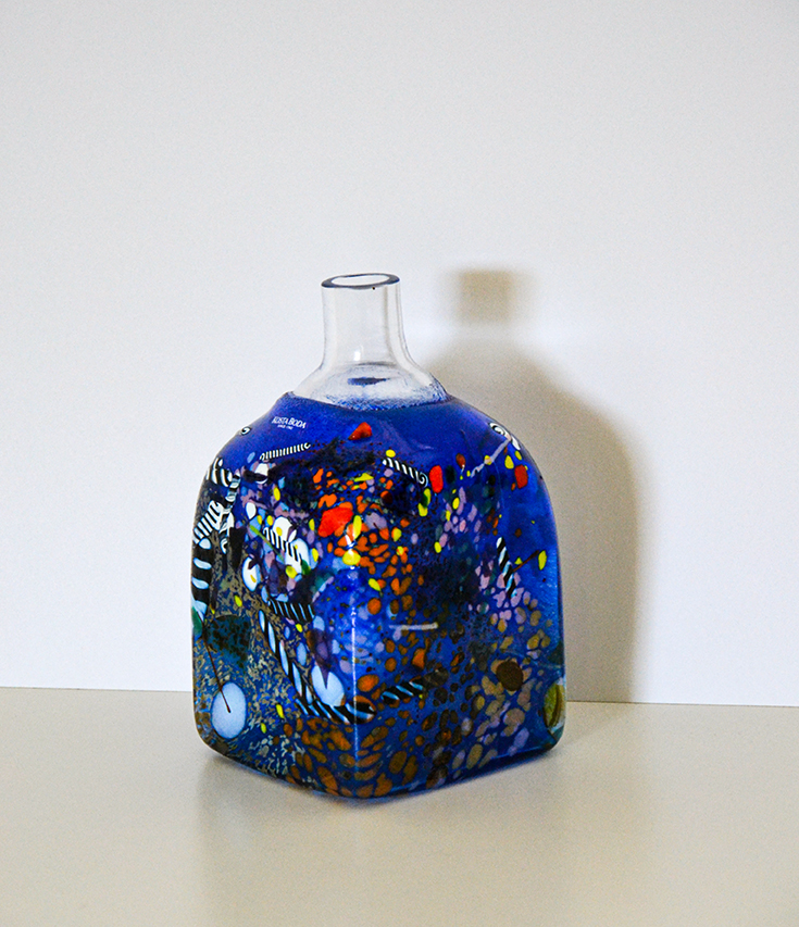 Piccola bottigla a forma quadrata con decorazione policroma in fusione realizzata a mano da Bertil Vallien per Kosta Boda nel 1991.