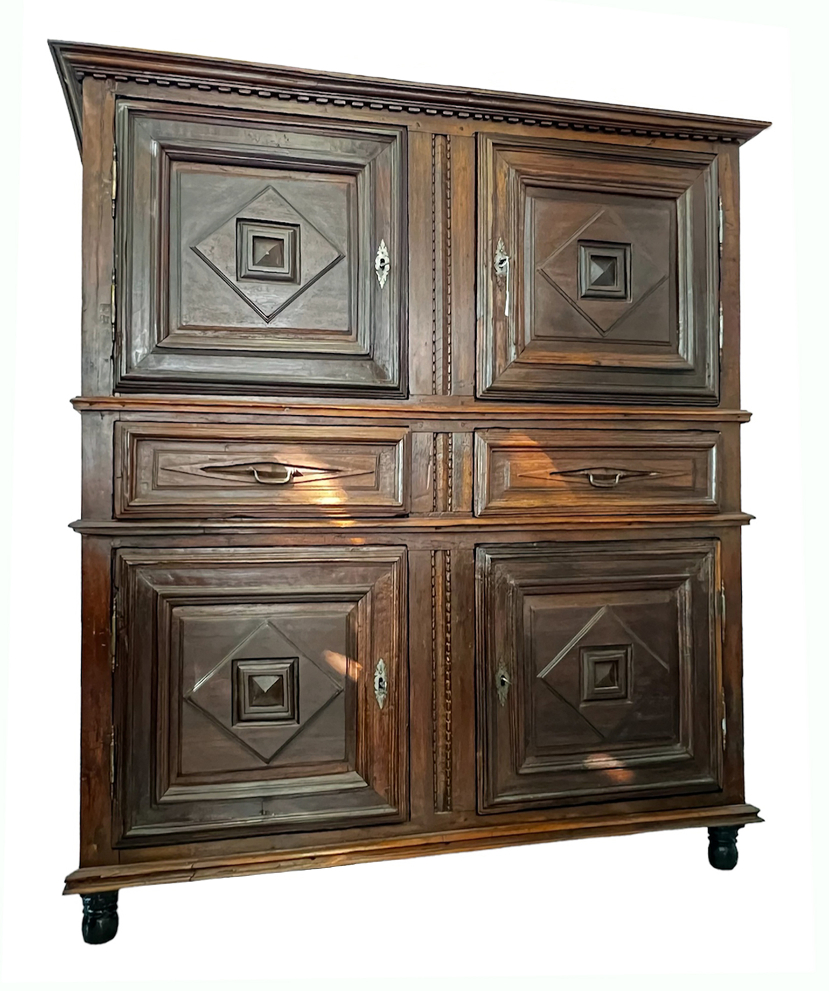 Antico mobile in noce a corpo unico munito di quattro ante e due cassetti scolpiti a punta di diamante.