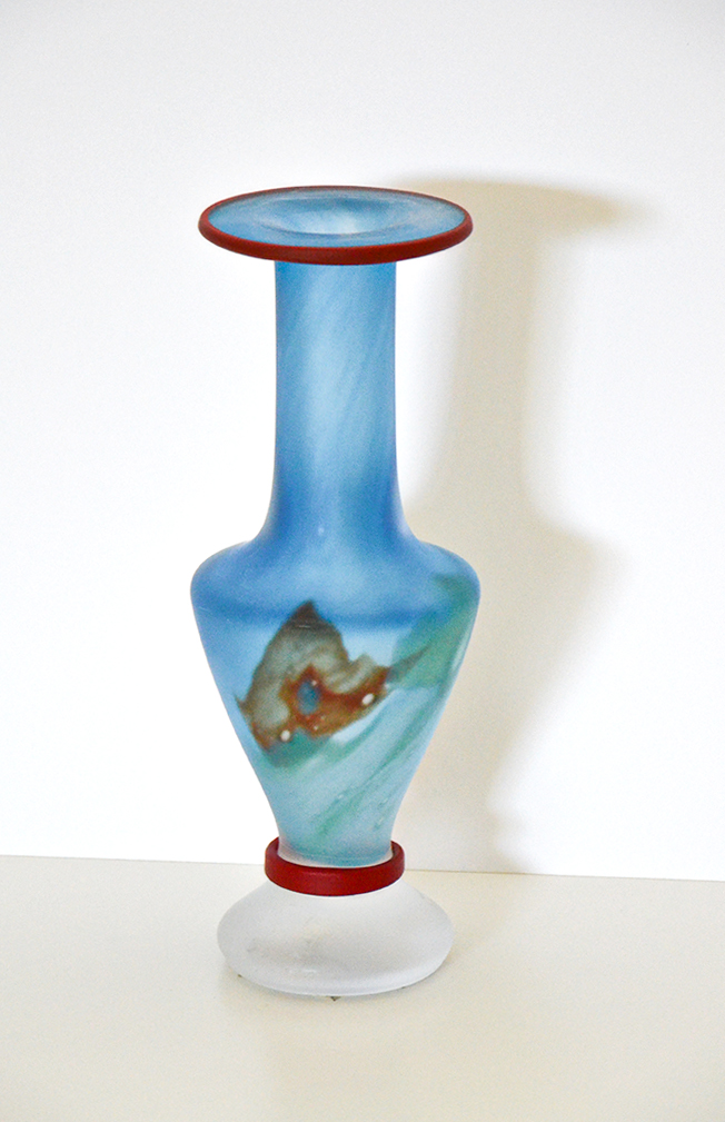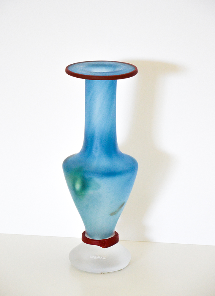 Vaso in vetro smerigliato bluette con accenti rossi della serie Kosta Boda Pandora in edizione limitata firmato dall'artista Monica Backström datato 1991.