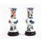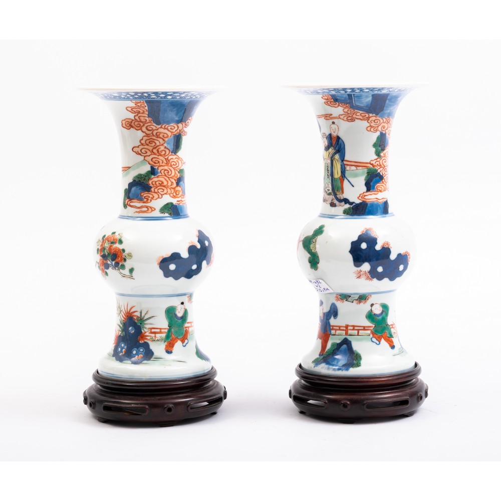 Coppia vasi in porcellana bianca decorata, basi in legno.