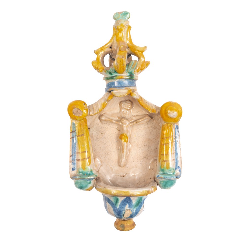 Acquasantiera in ceramica smaltata e decorata.