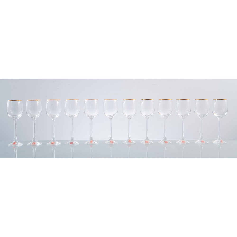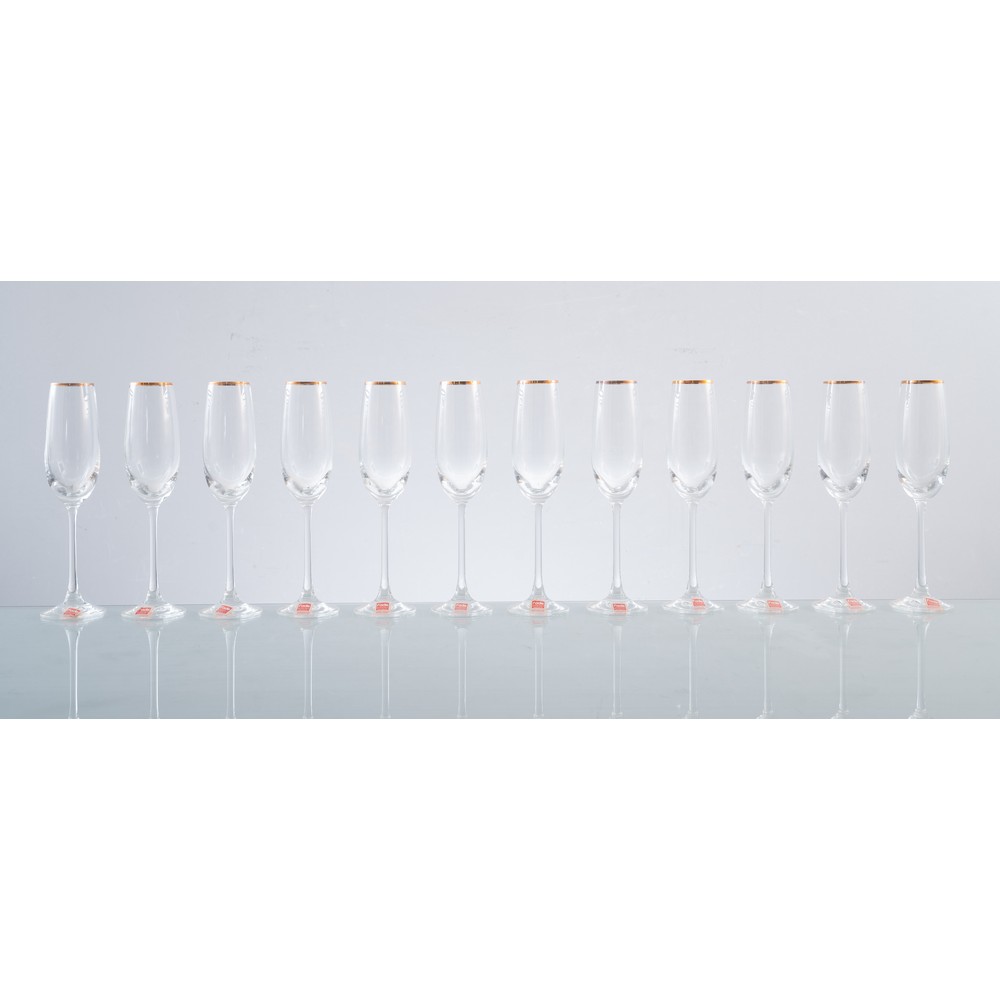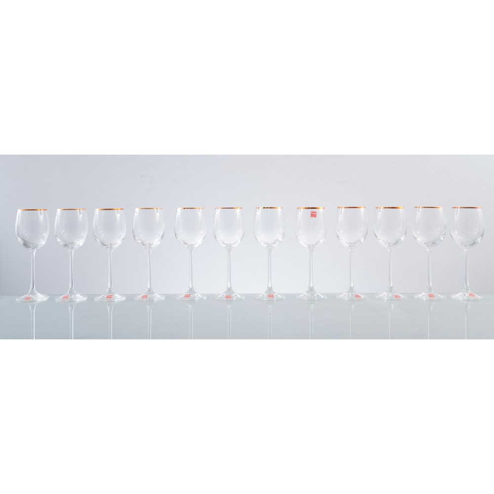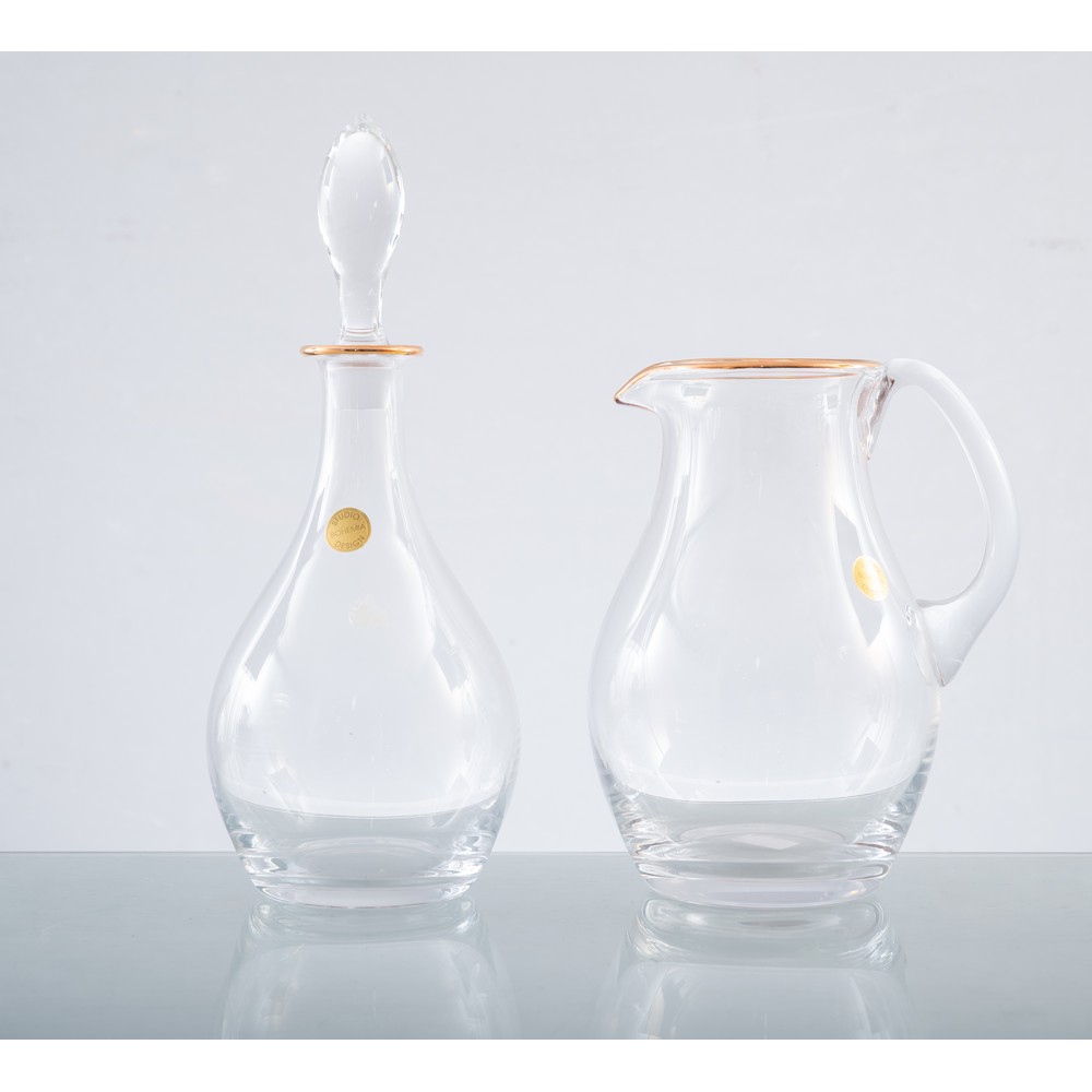 Servizio di bicchieri in cristallo con bordure in oro composto da: brocca, bottiglia, 12 flutes, 12 bicchieri acqua e 12 bicchieri vino.