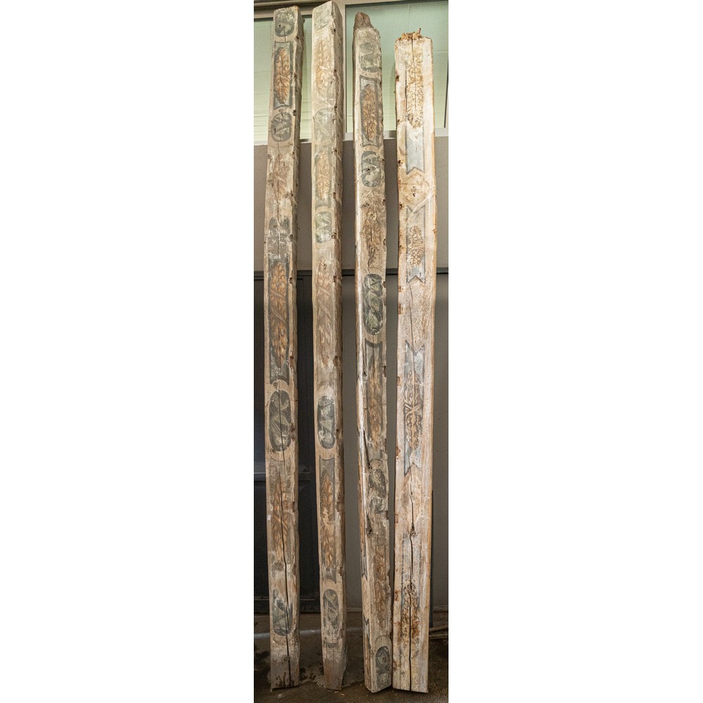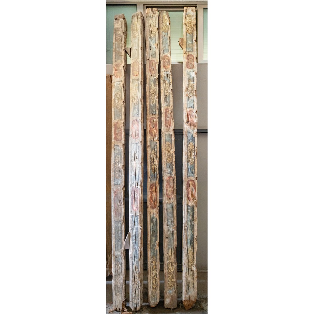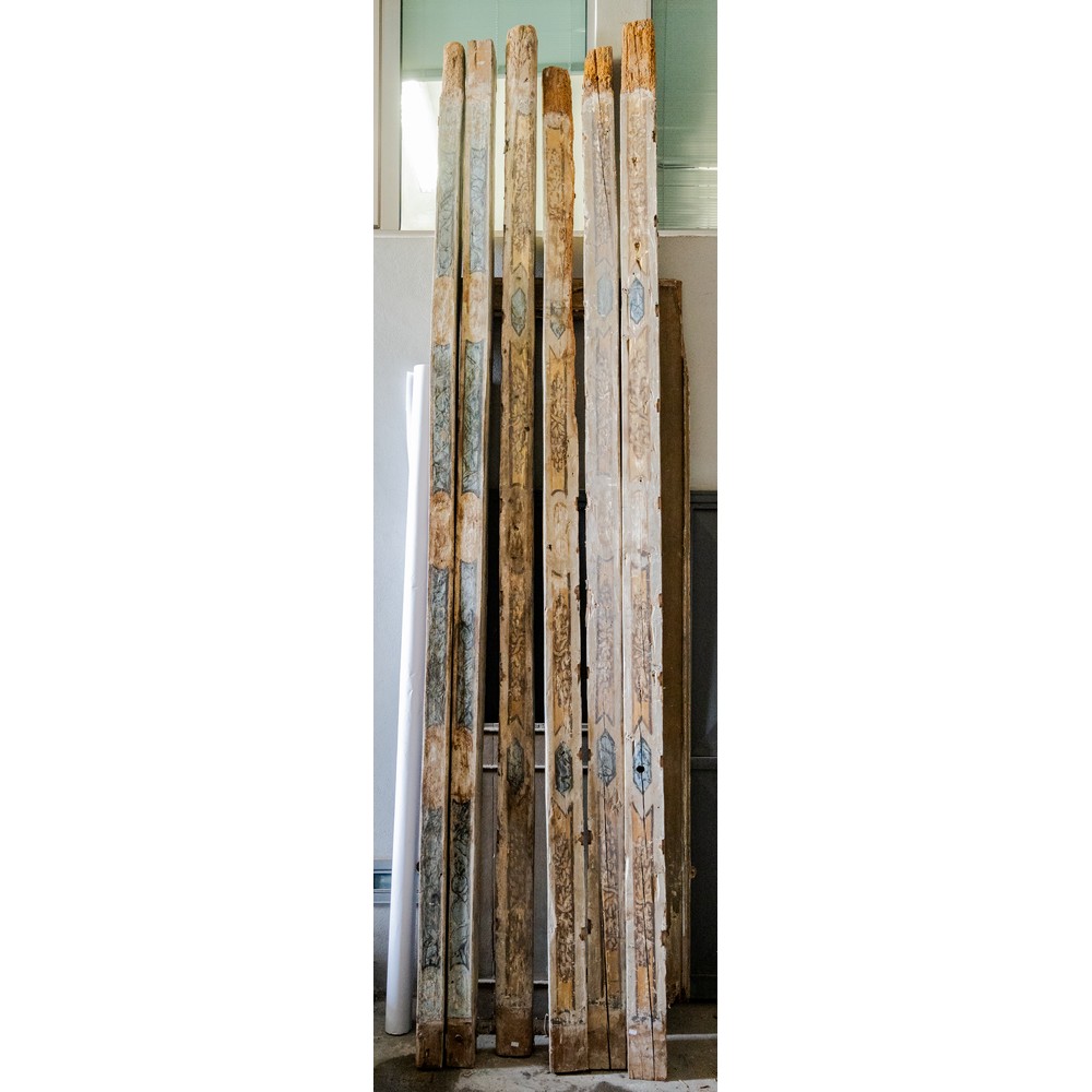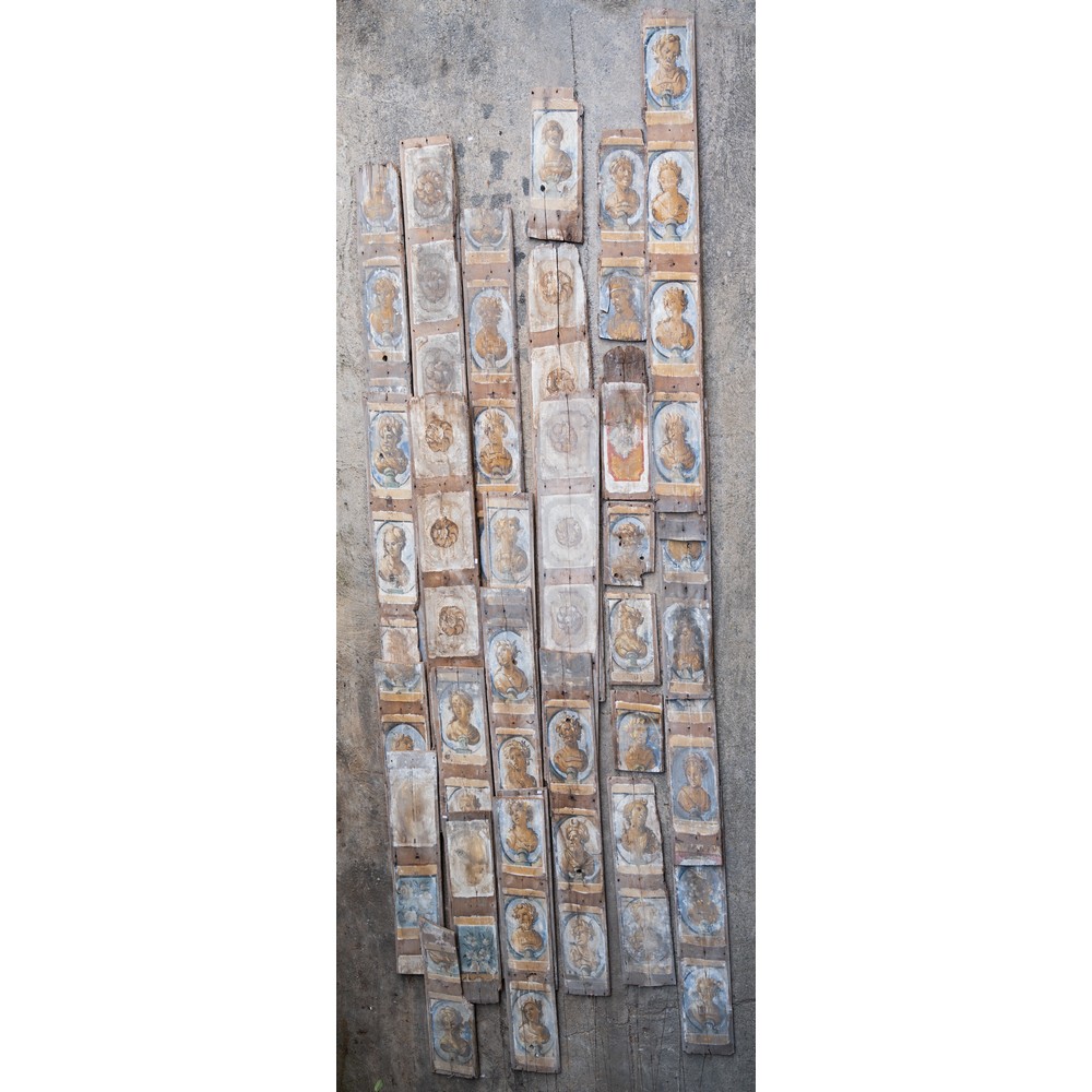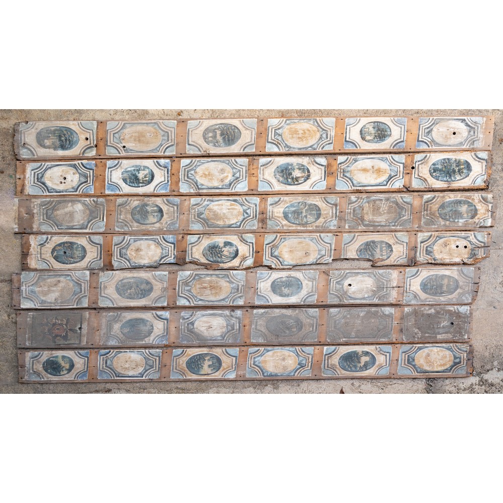 114 tavole da soffitto dipinte a motivo floreale e fogliaceo e 21 travi in legno decorato e dipinto.