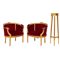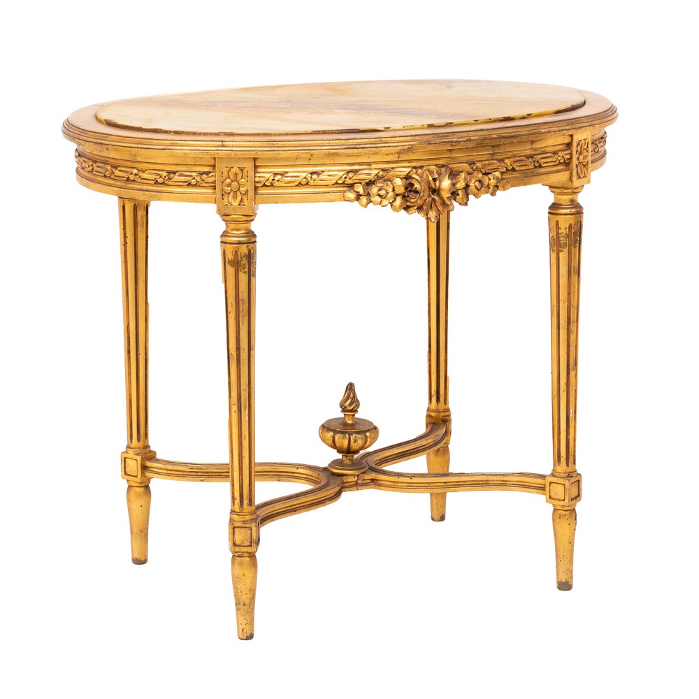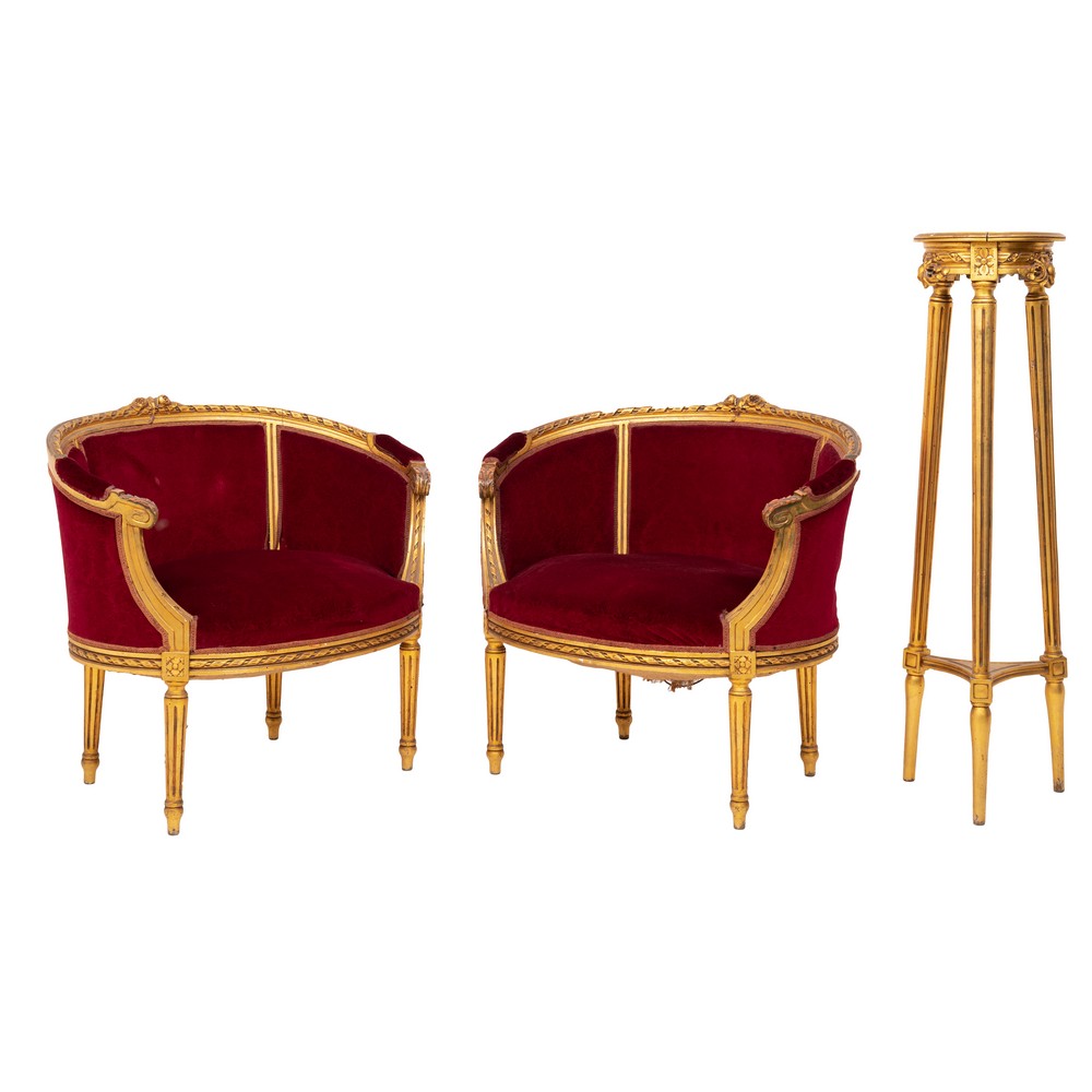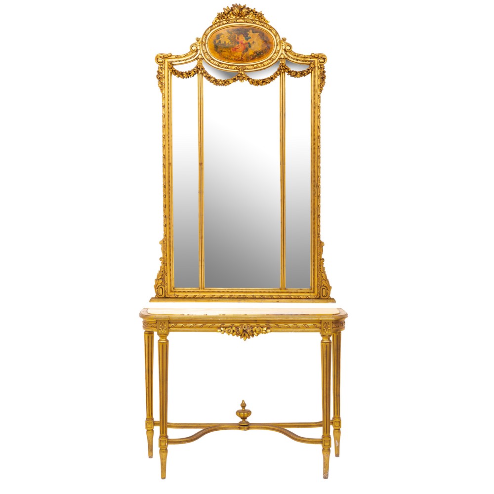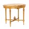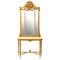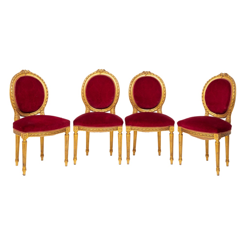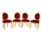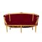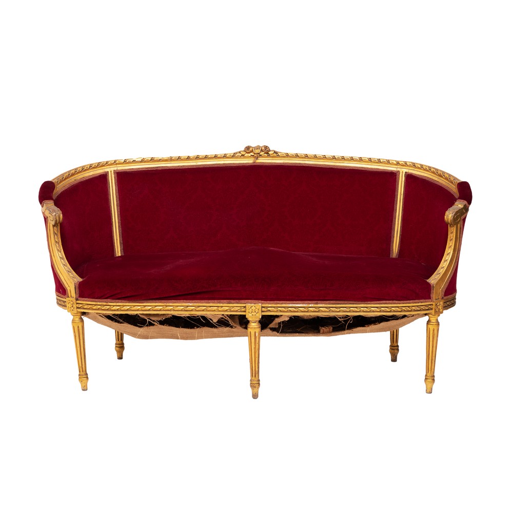 SALOTTO stile Luigi XVI in legno dorato con tappezzeria in velluto rosso cardinalizzio composta da divano, due poltrone, quattro sedie, consolle con piano in marmo giallo di Siena e specchiera, tavolino, specchiera e cantone.
