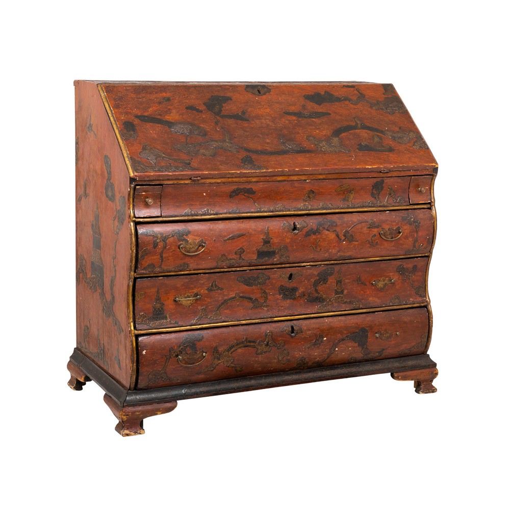 Ribalta con quattro cassetti in lacce e disegni di gusto orientale a rilievo.