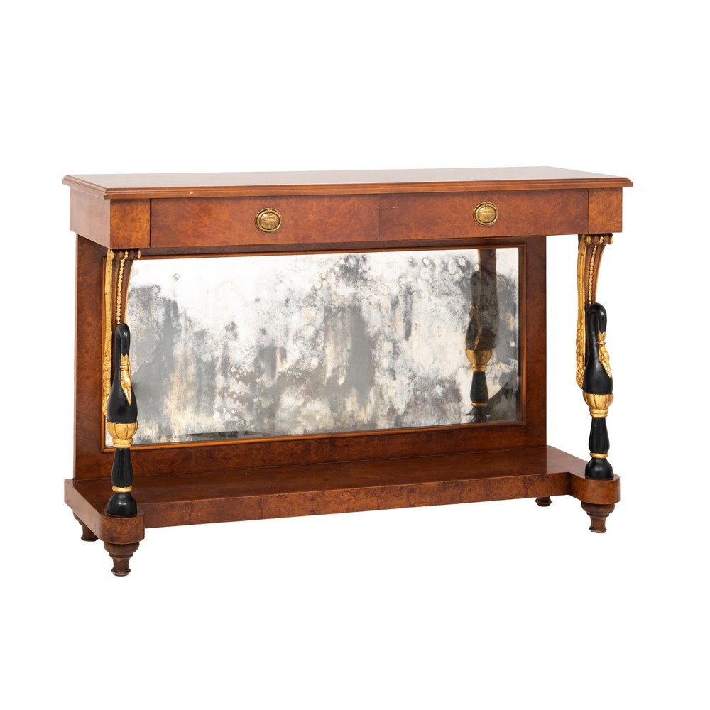 CONSOLLE stile Impero in radica di tuia, con piedi a guisa di cigni, in legno laccato e dorato.