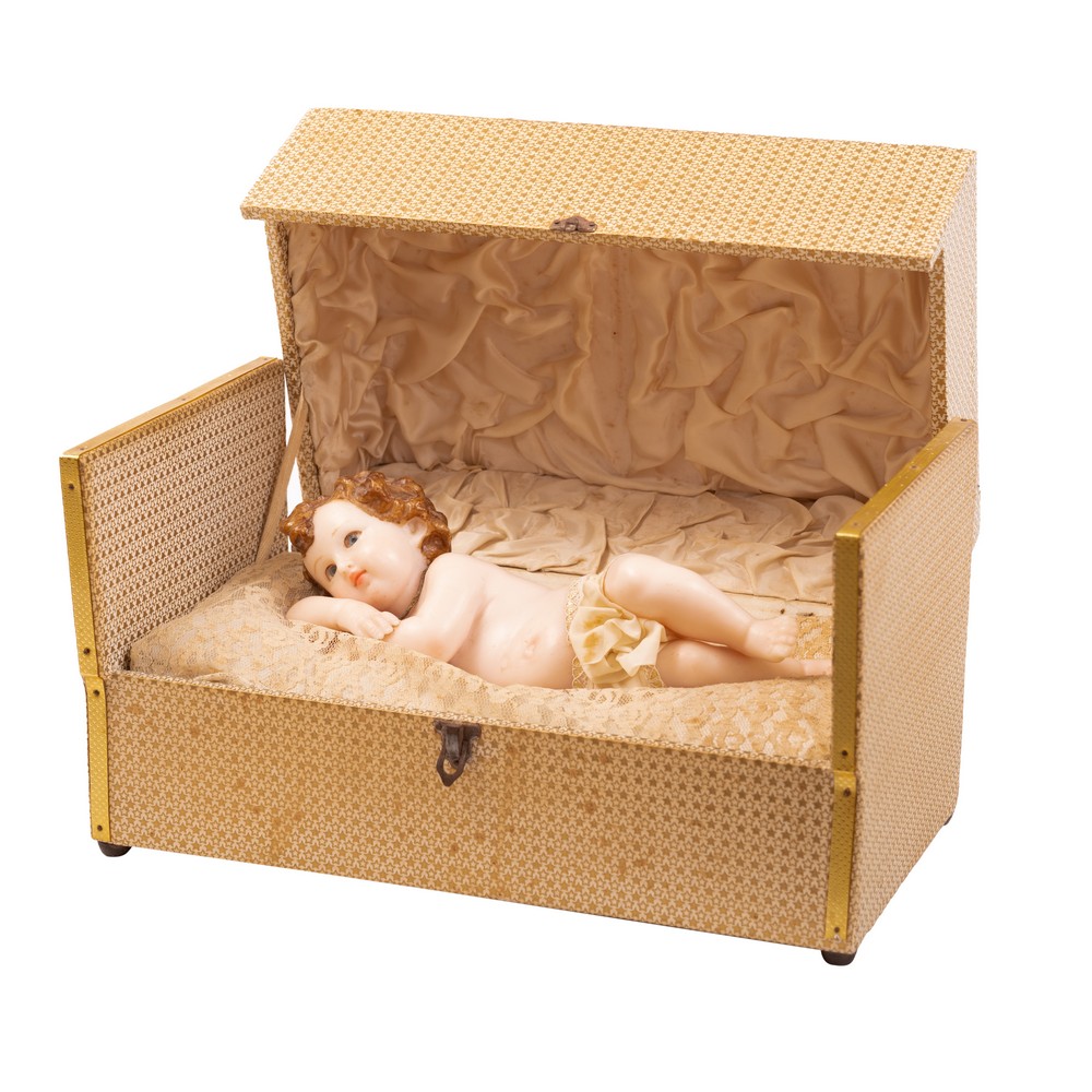 Scultura Bambin Gesù in ceroplastica policroma entro scatola carillon (usure del tempo).