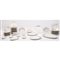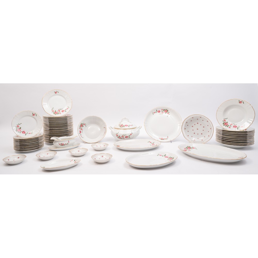Servizio di piatti in porcellana, decori a motivo floreale, composto da: 24 piatti piani, 12 piatti fondi, 12 piatti frutta, zuppiera, insalatiera, piatto portata tondo, 3 piatti portata ovali, raviera, salsiera, mestolino e una ciotola e 5 ciotoline di diversa tipologia.