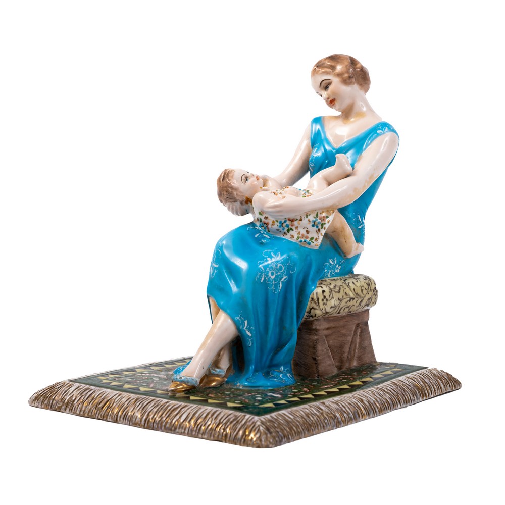 Scultura raffigurante "Mamma con bambino" in ceramica policroma.