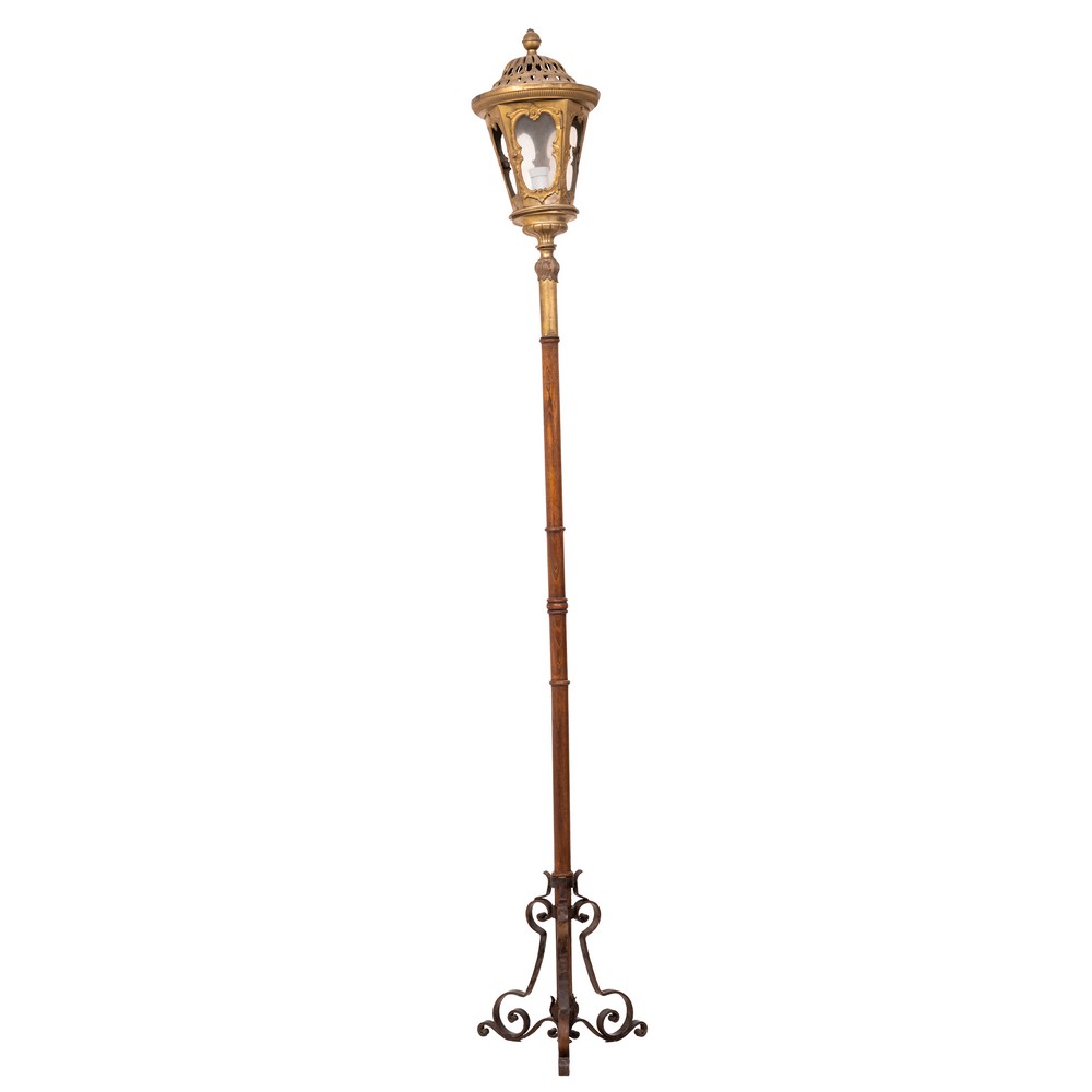 LANTERNA in metallo trasformata a lume con bastone in legno e base in ferro.