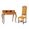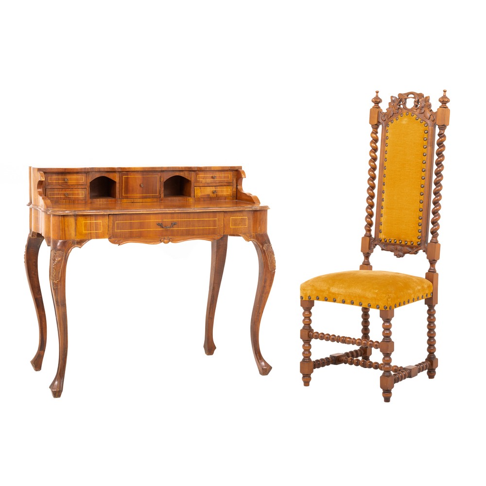 SCRITTOIETTO di gusto Barocco in legno di noce, con filettatura in bosso e sedia in legno tipo coloniale.