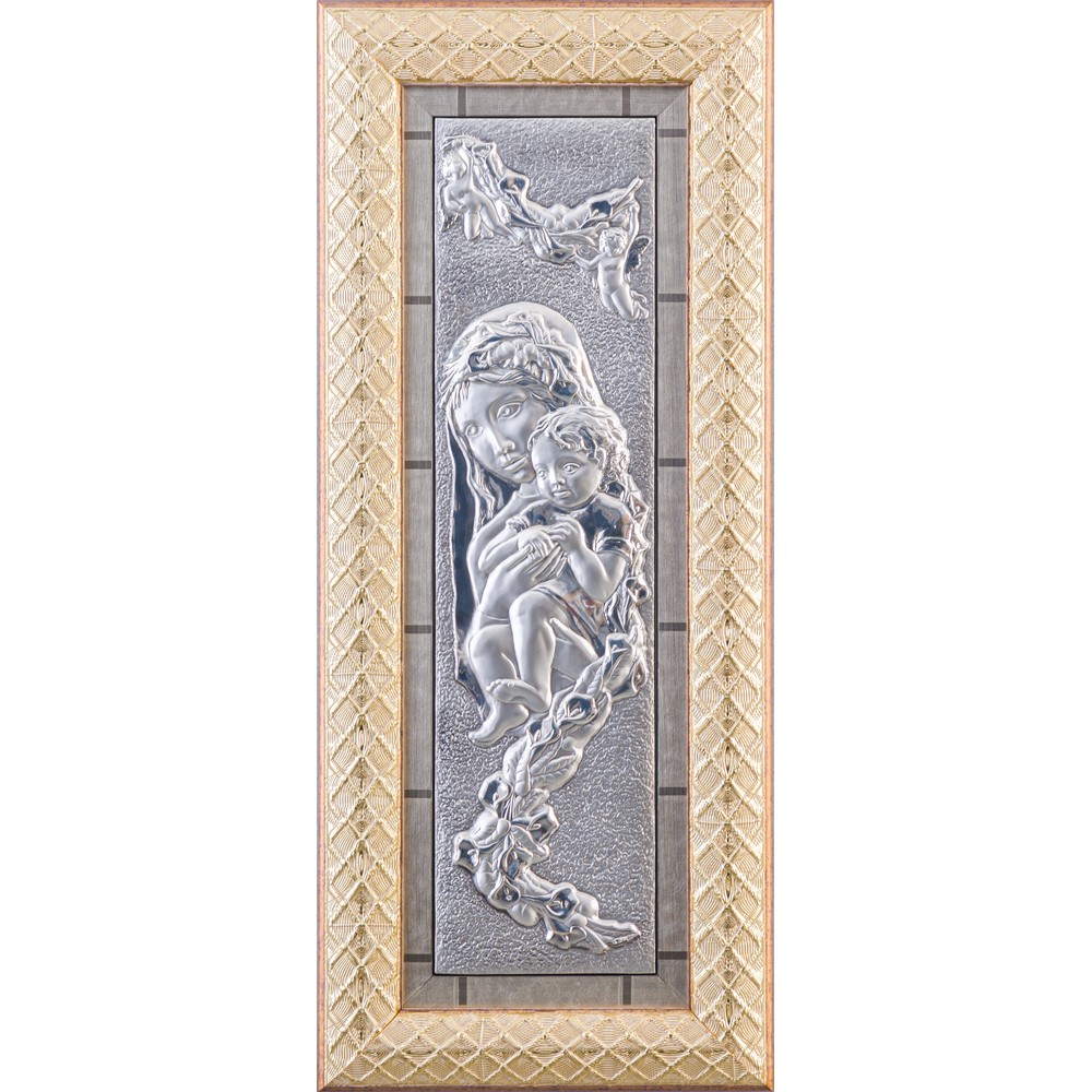BASSORILIEVO rivestito in lamina d'argento 925 raffigurante "Madonna con Bambinello e putti".