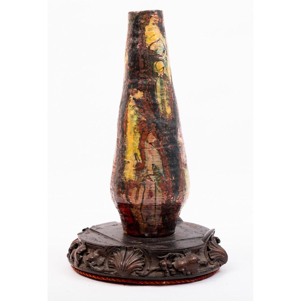 VASO in ceramica smaltata e decorata con base in legno.